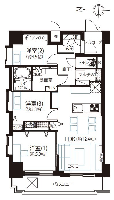 | 間取 | 3LDK (LDK12.4帖、洋室5.9帖、洋室4.5帖、洋室3.8帖) | ||