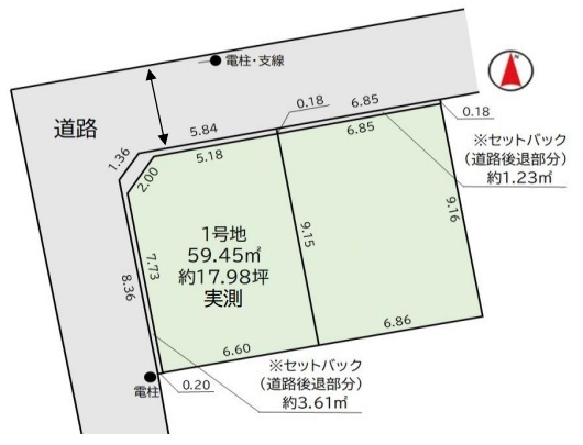 | 土地面積 | 59.45m² 実測 (私道429m²別に有、私道持分比率:8/129、セットバック3.61m²) | ||