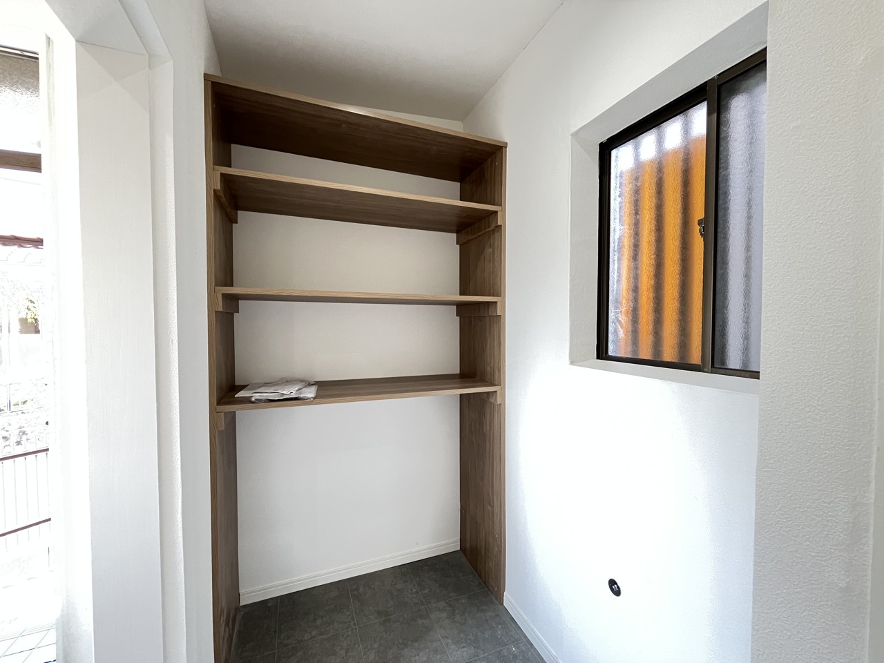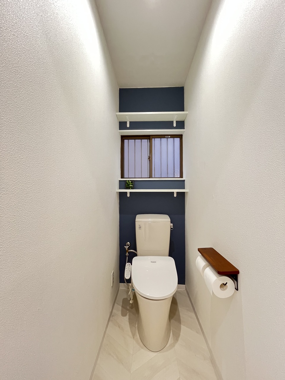 ウォシュレット機能付きのトイレ。換気のしやすい窓付きで、収納もあり実用性も兼ね備えた造り。