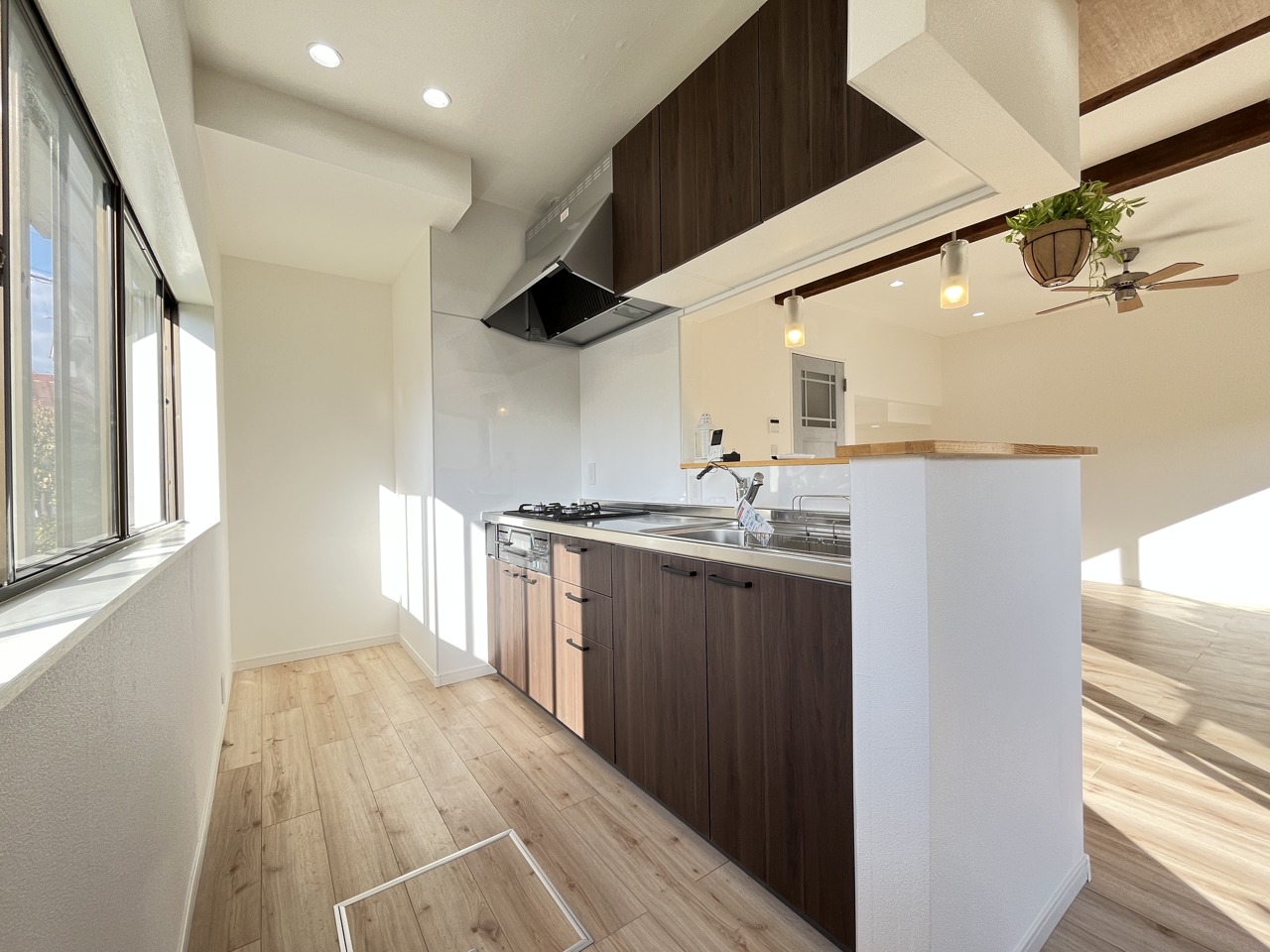 リビングにいる家族の顔が見渡せるカウンターキッチン。お料理もより一層おいしく、楽しく。食器棚を背面に設置しても十分な広さを確保しています。
