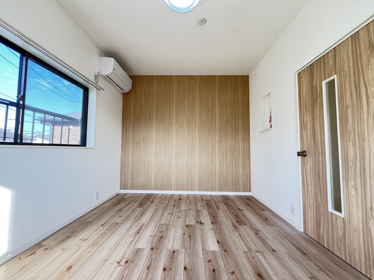 アクセントクロスを使用したオシャレな洋室。窓からそそぐ陽の光が眩しいベッドルームは、朝の目覚めが心地良く迎えられそうです。