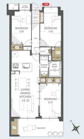 | 間取 | 3LDK (LDK14.3帖、洋室6.3帖、洋室5.9帖、洋室5.9帖) | ||