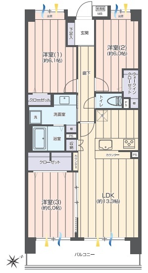 | 間取 | 3LDK (LDK13.3帖、洋室6.1帖、洋室6.0帖、洋室6.0帖) | ||