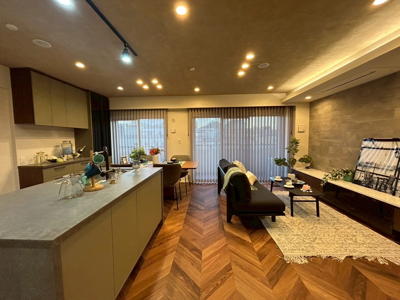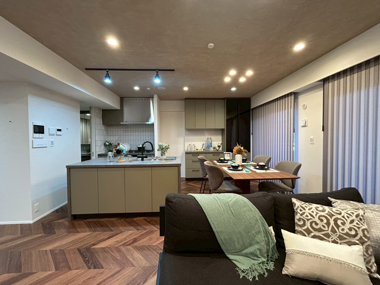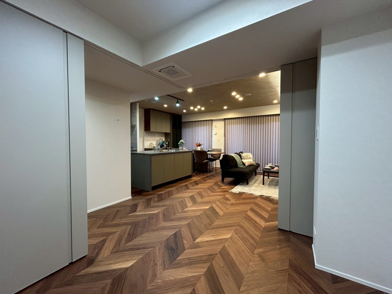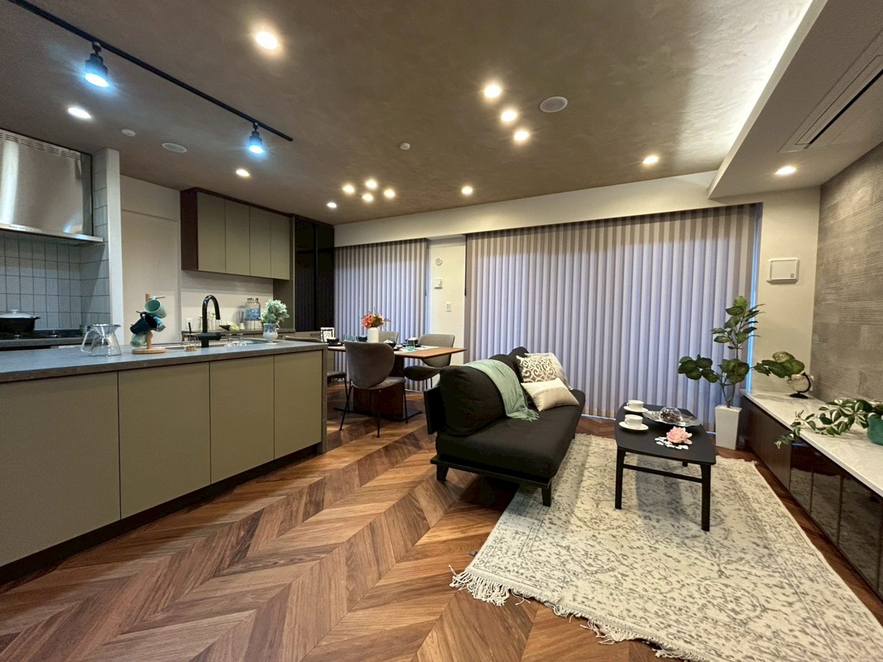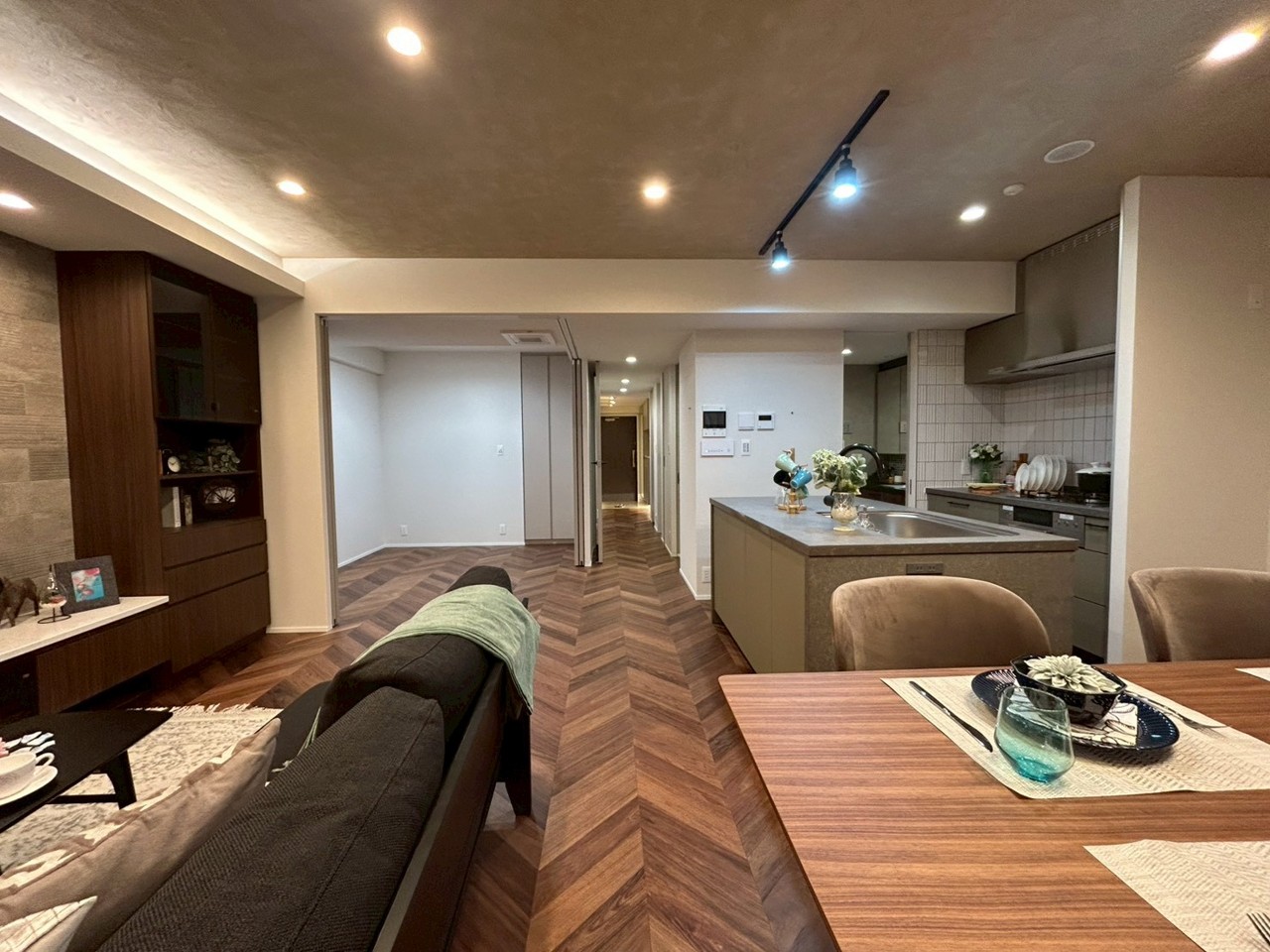 南東向きのリノベーション住戸、クオーツカウンターのアイランドキッチン、造作収納やエコカラット、床暖房や大型食洗器など設備も充実してます。