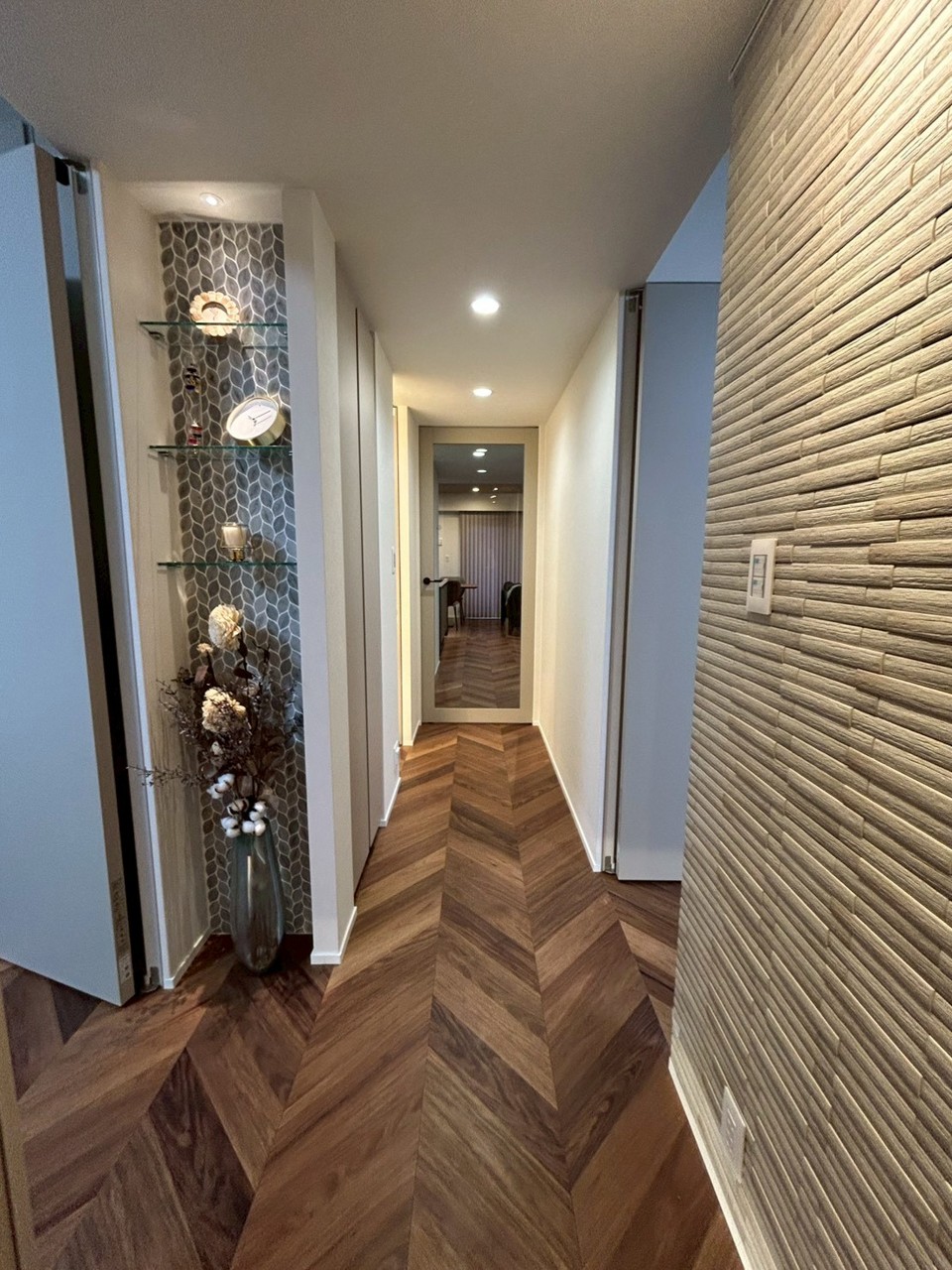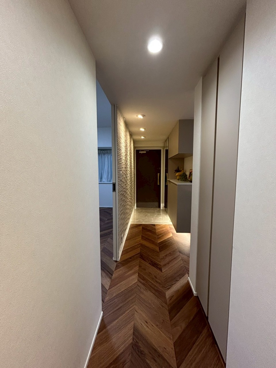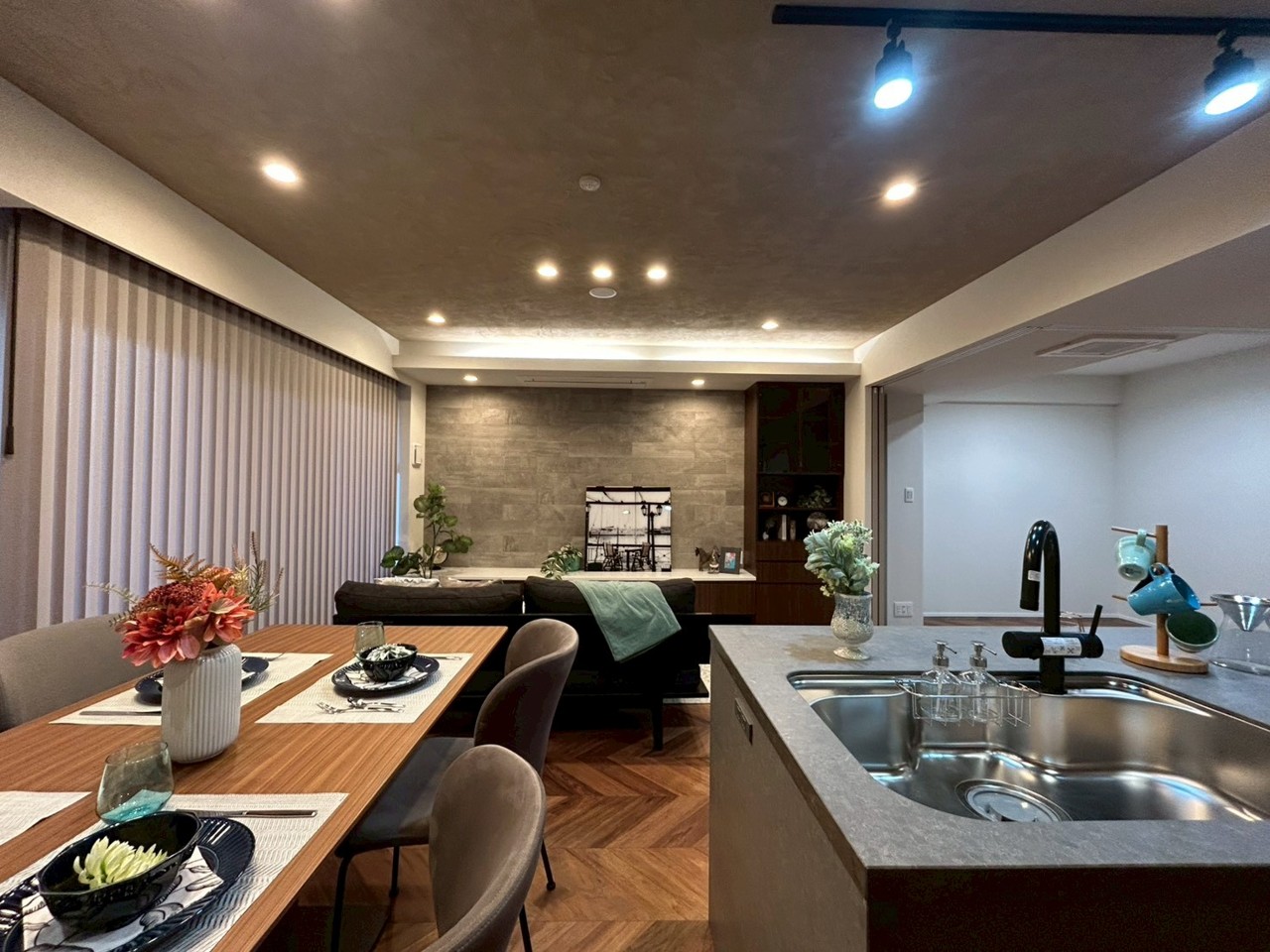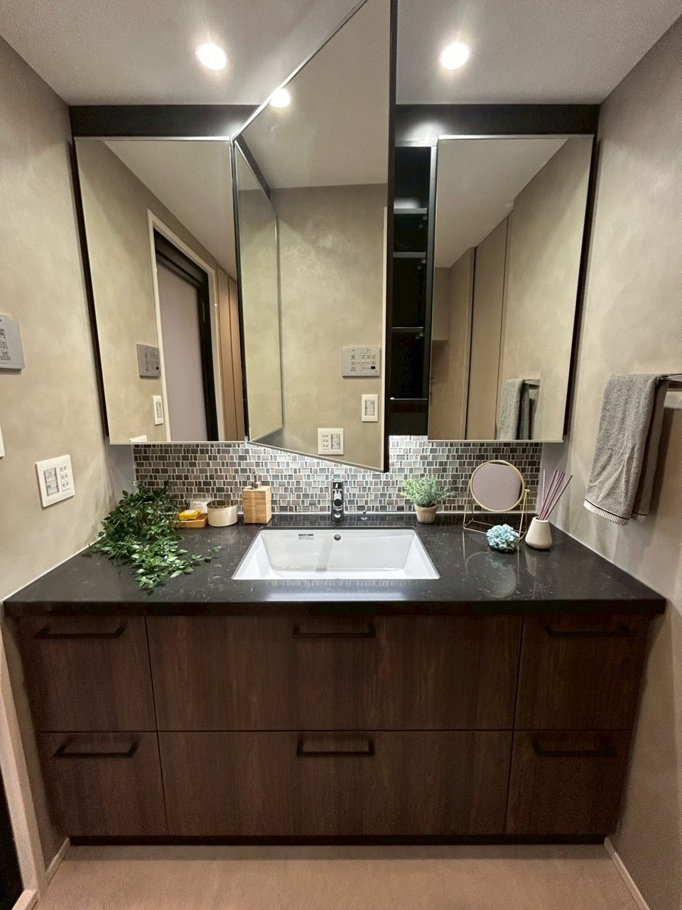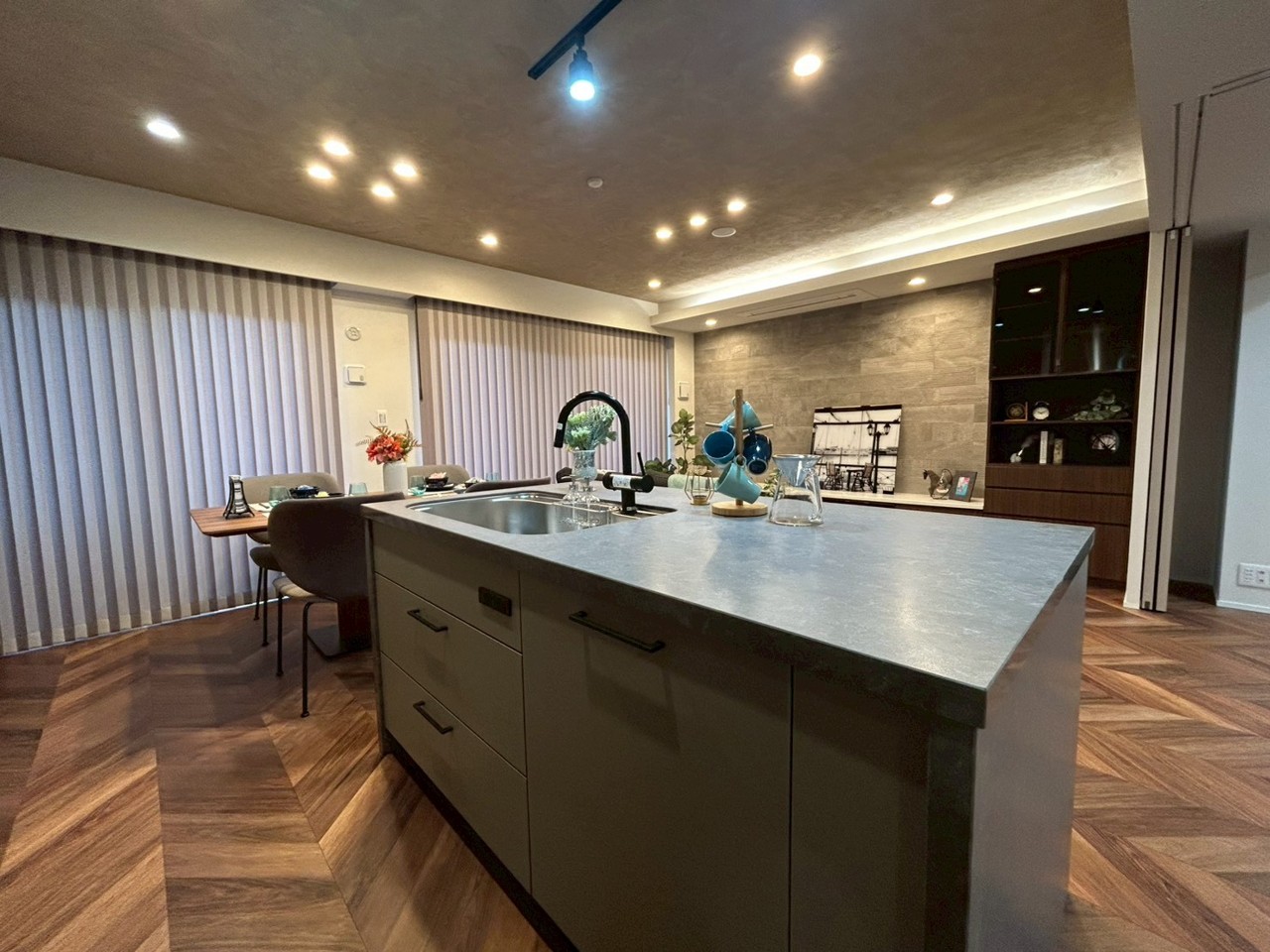 南東向きのリノベーション住戸、クオーツカウンターのアイランドキッチン、造作収納やエコカラット、床暖房や大型食洗器など設備も充実してます。