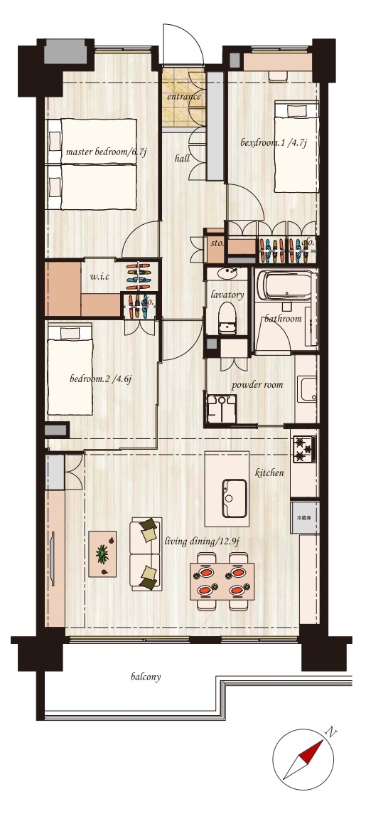 | 間取 | 3LDK (LDK12.9帖、洋室6.7帖、洋室4.7帖、洋室4.6帖) | ||