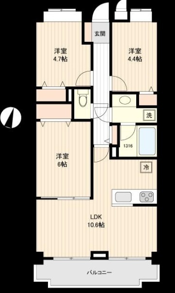 | 間取 | 3LDK (LDK10.6帖、洋室6帖、洋室4.7帖、洋室4.4帖) | ||