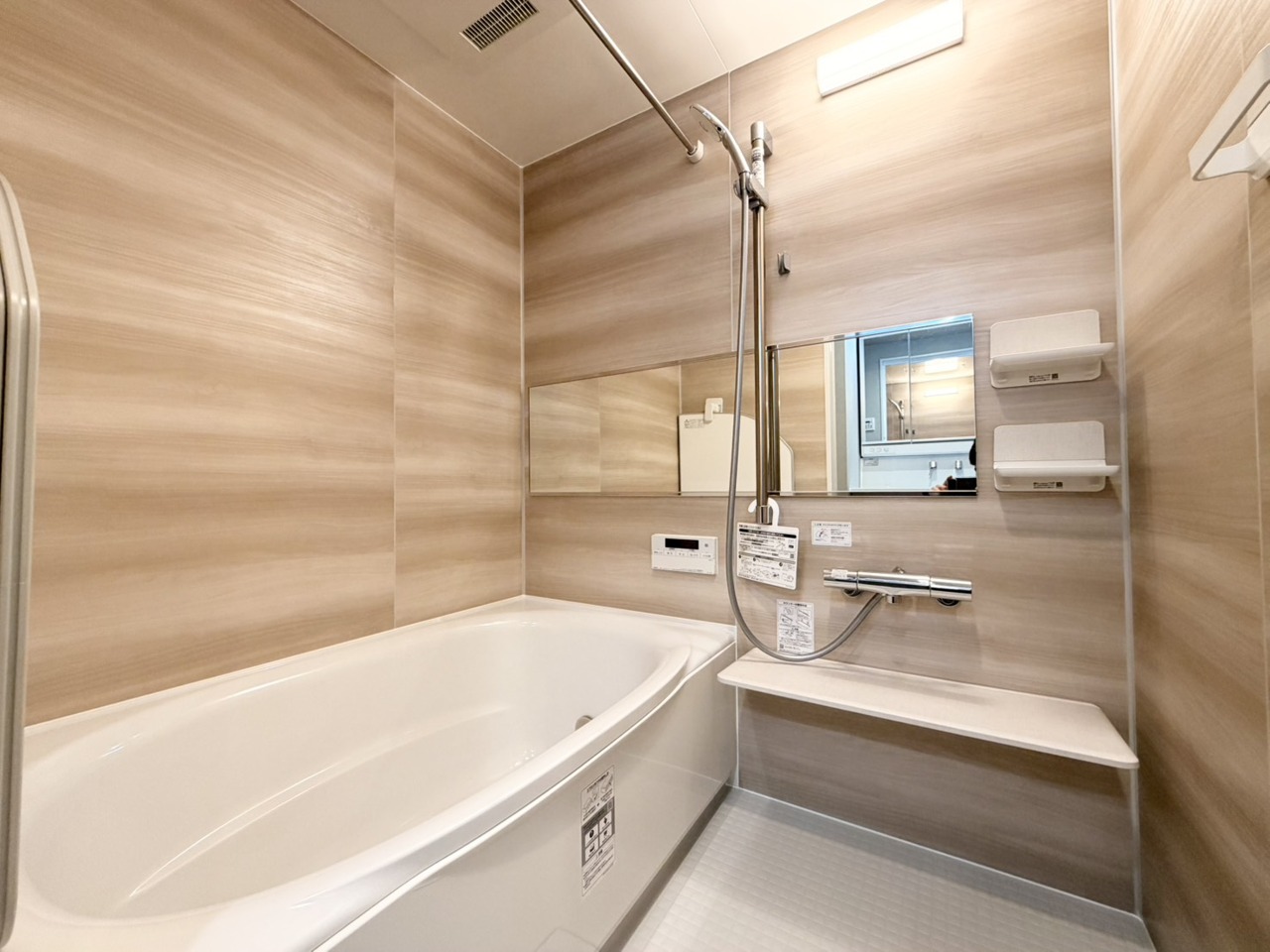 暖かな木目調の壁に包まれた、ゆったりとくつろげるバスルーム。