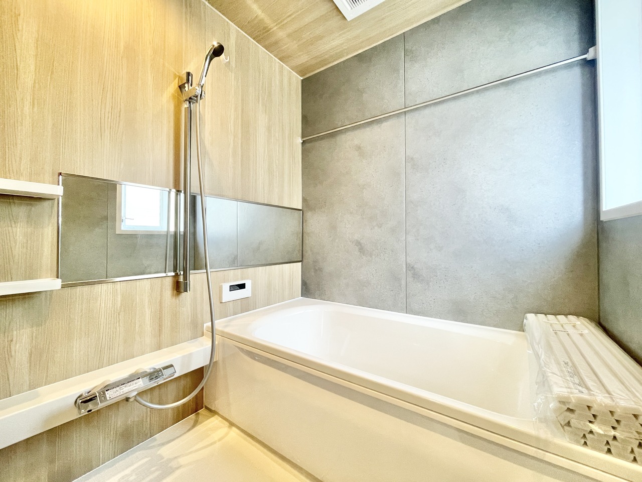 温かみのある木目調とクールな石調が調和する、落ち着いたバスルーム。