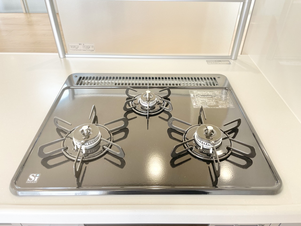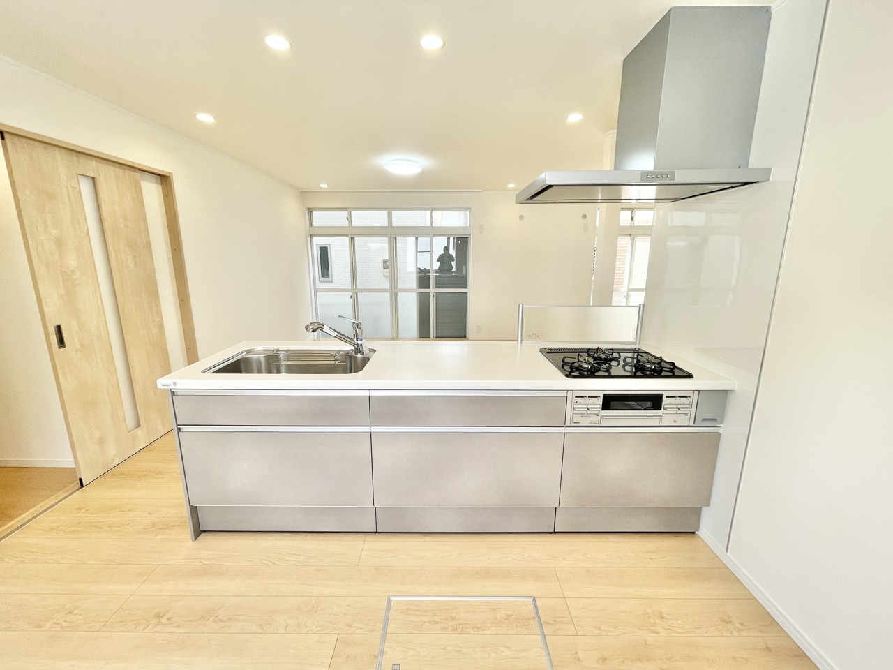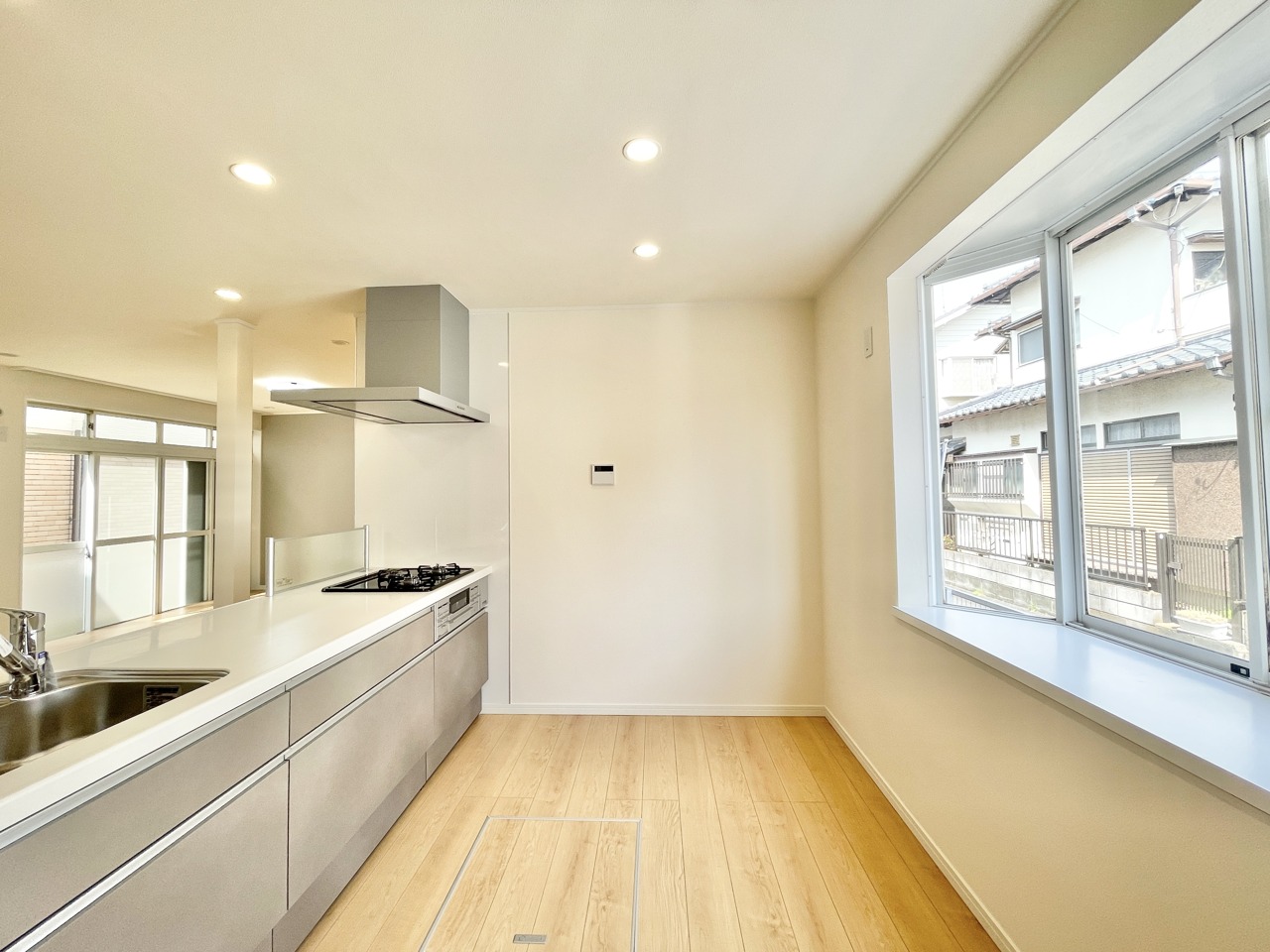 キッチンの背面に窓がついており、風通しの良いキッチンスペースです。 幅も広いため、カップボードも配置可能です。