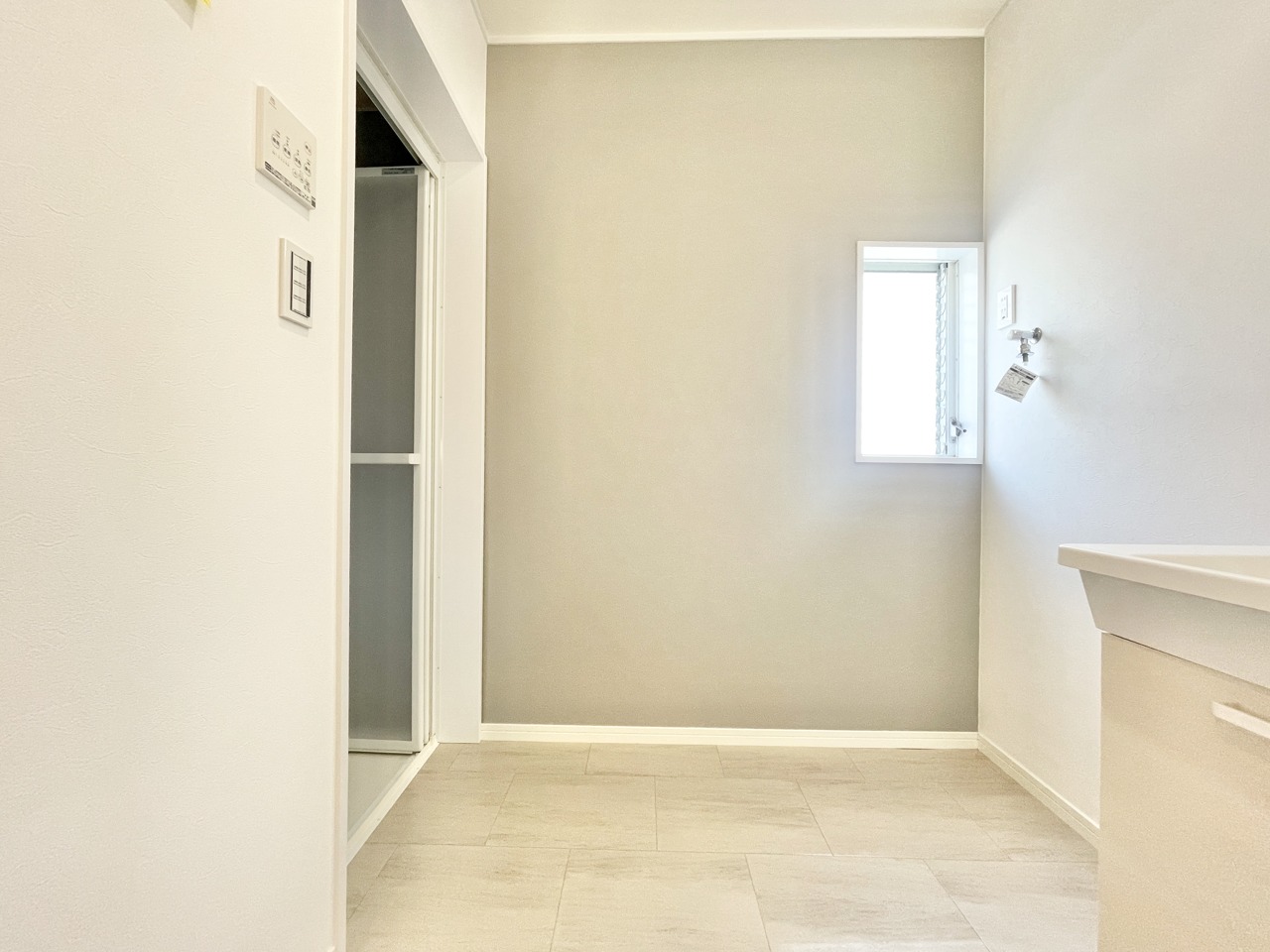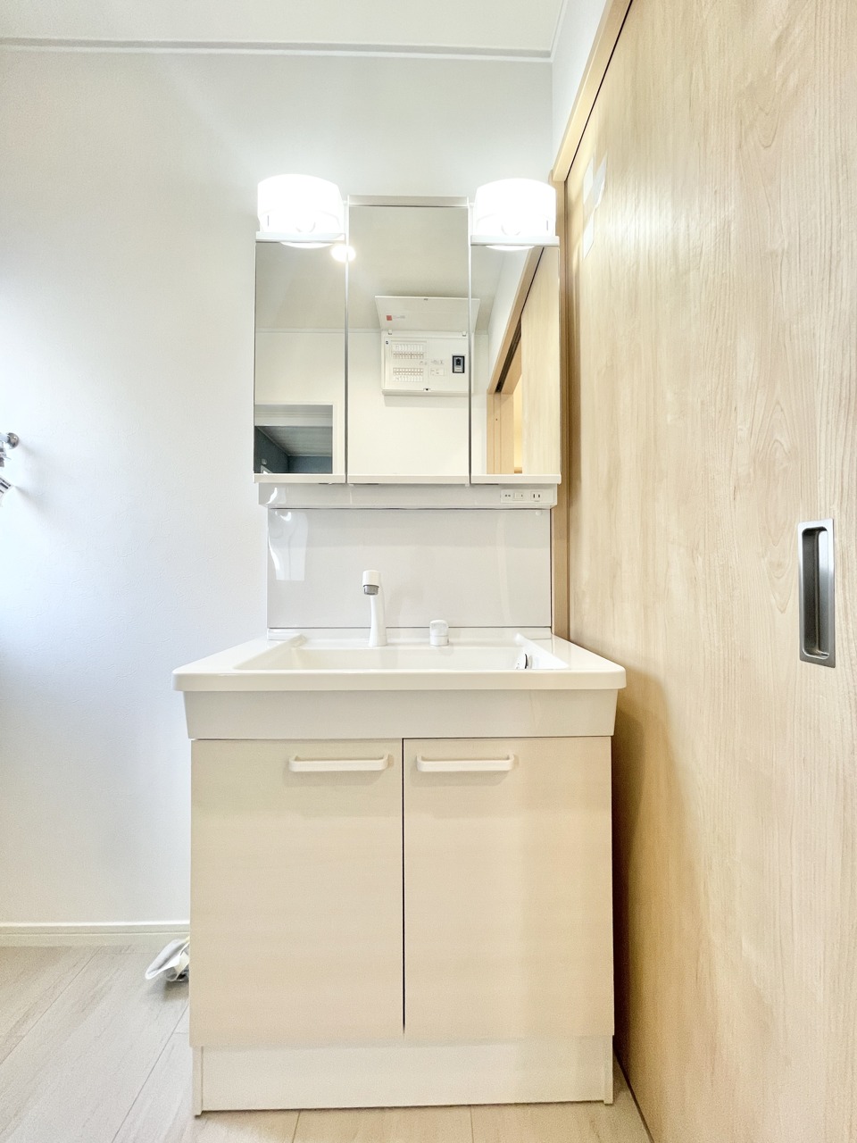 収納豊富な三面鏡付洗面化粧台。水回りのあれこれがキレイに収まりそうですね。