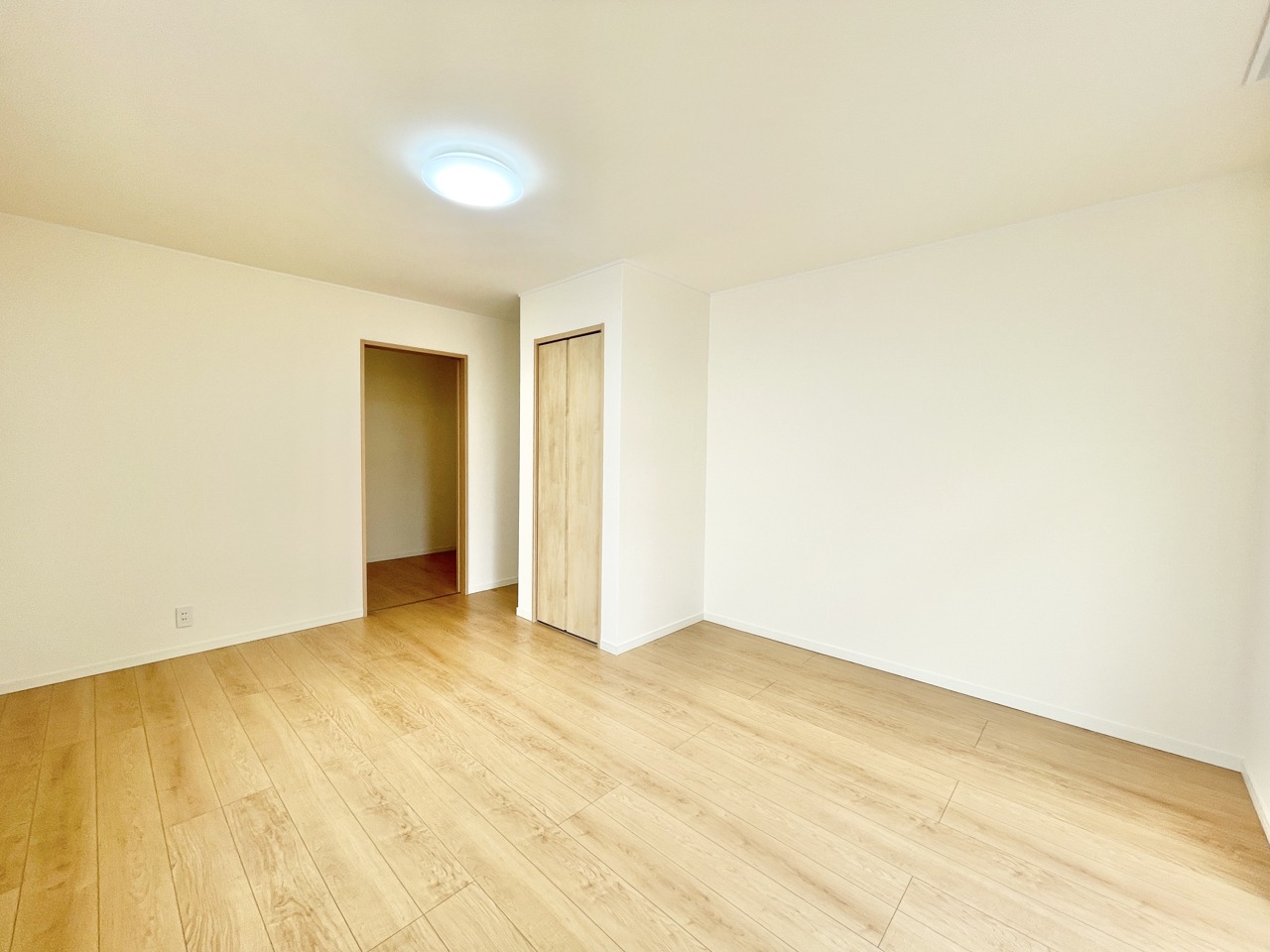 大きめのベッドを置いても、まだゆとりが持てる大きさ。約9帖の主寝室。