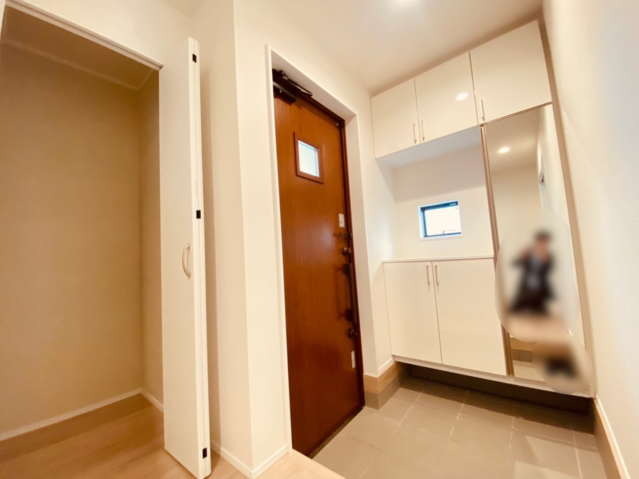 お宅の顔となる明るく開放的な玄関。ご家族皆様様の靴を収納できるスペースと全身鏡があり、お出掛け前に身だしなみチェックもできます。