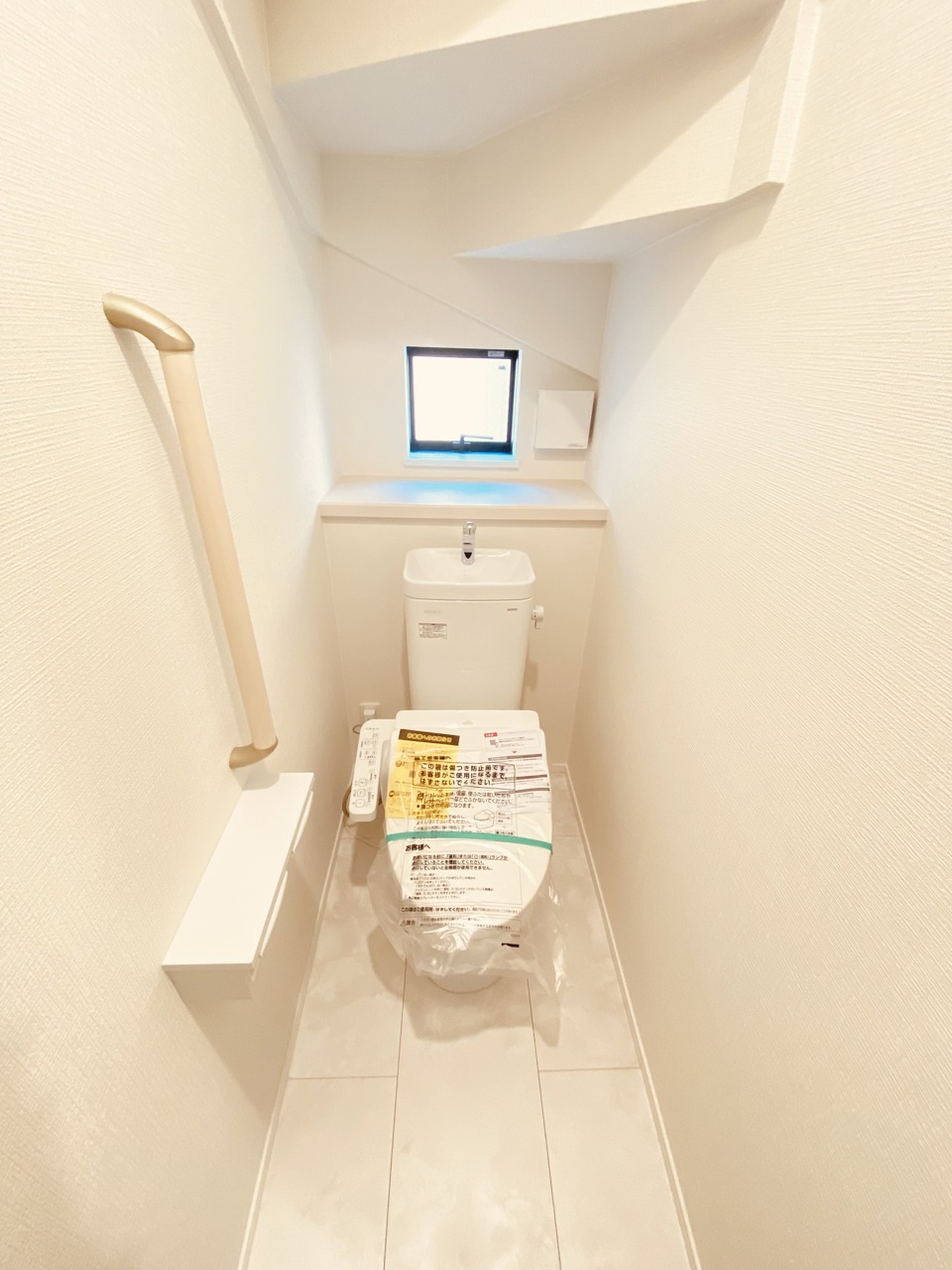 ウォシュレット機能付きのトイレ。換気のしやすい窓付きで、収納もあり実用性も兼ね備えた造り。