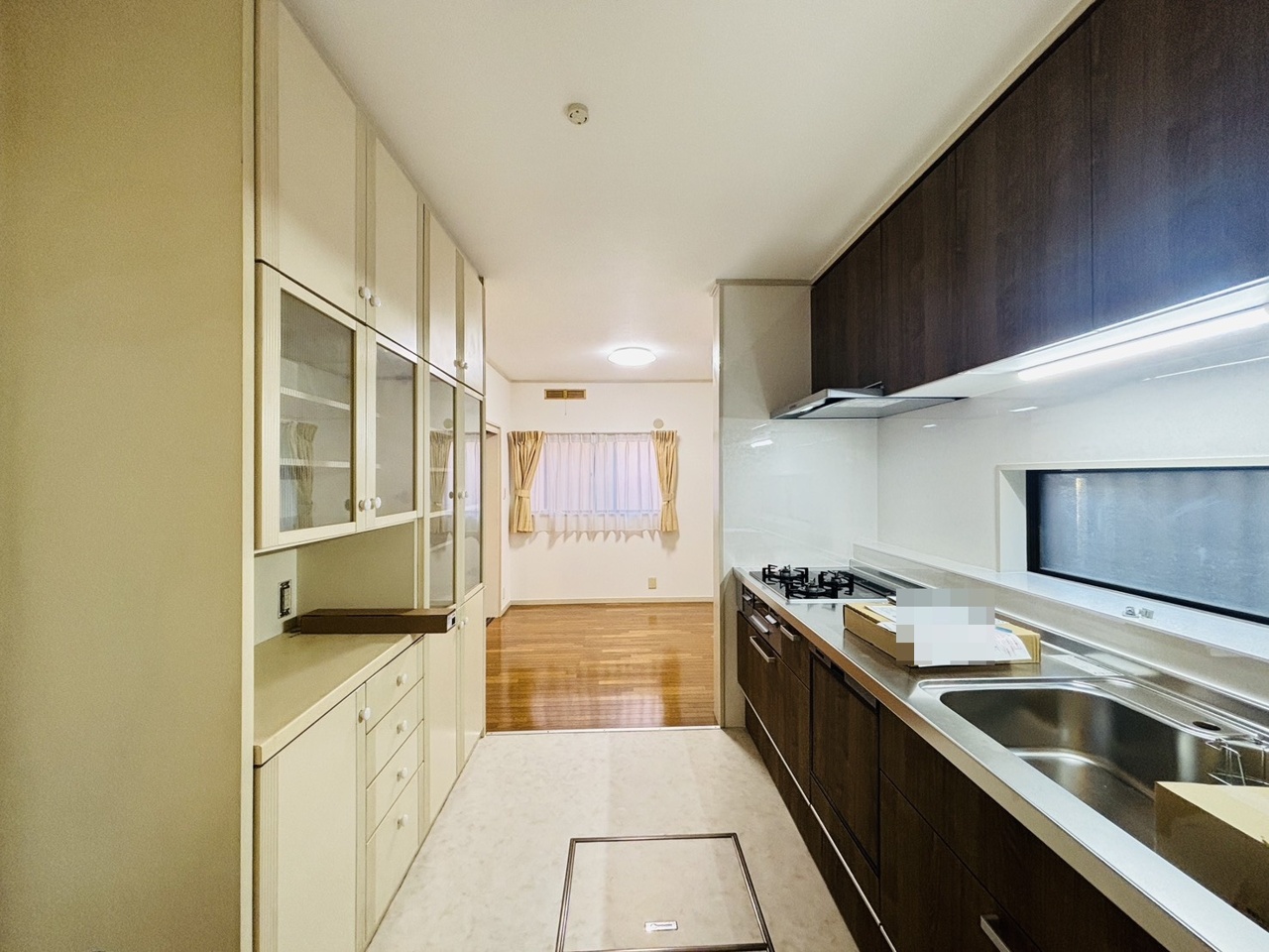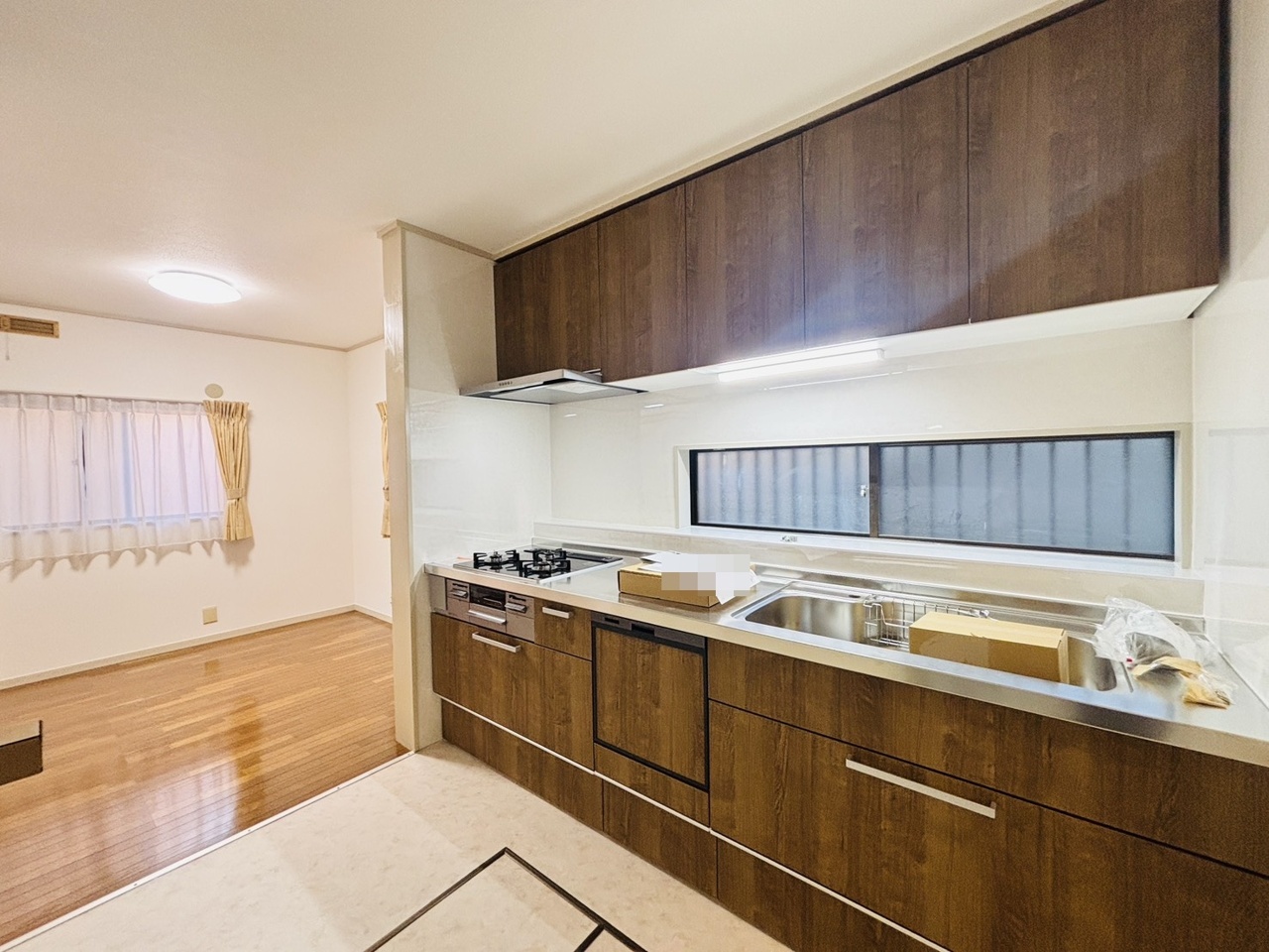 収納量豊富なシステムキッチン。明るい光が差し込む窓も調味料置き場などに役立ちます。カウンターキッチンと違い、背面を広く使えるので自由度が高いのも嬉しいですね。