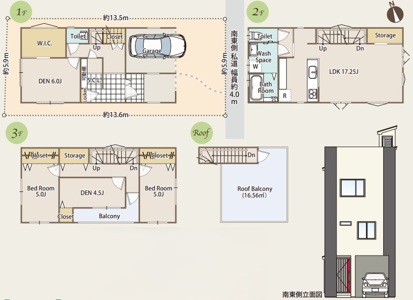 | 間取 | 2SLDK+WIC、ルーフバルコニー (LDK17.25帖、S6.0帖、S4.5帖、洋室5.0帖、洋室5.0帖) | ||