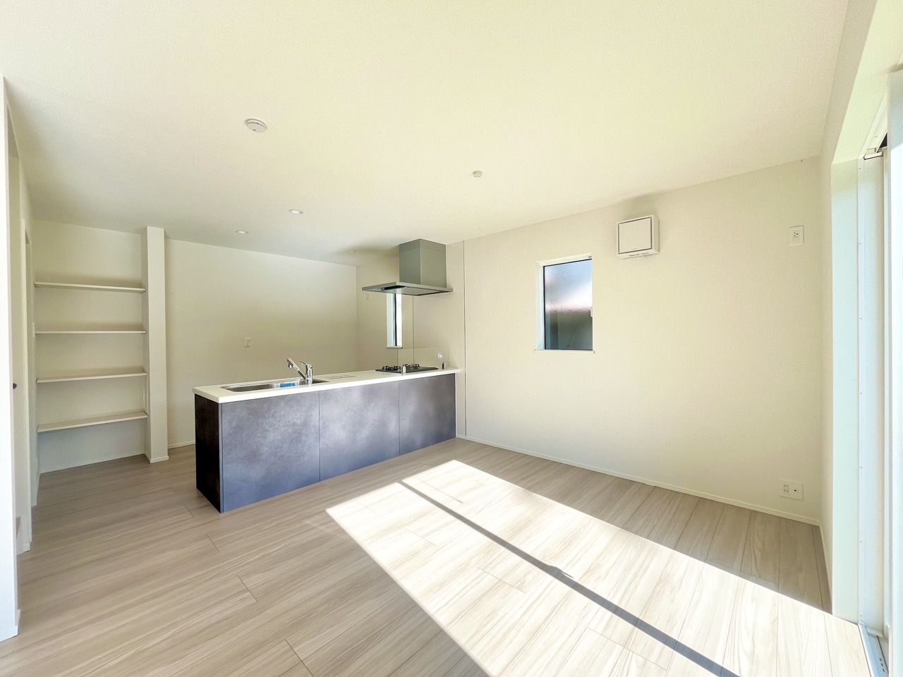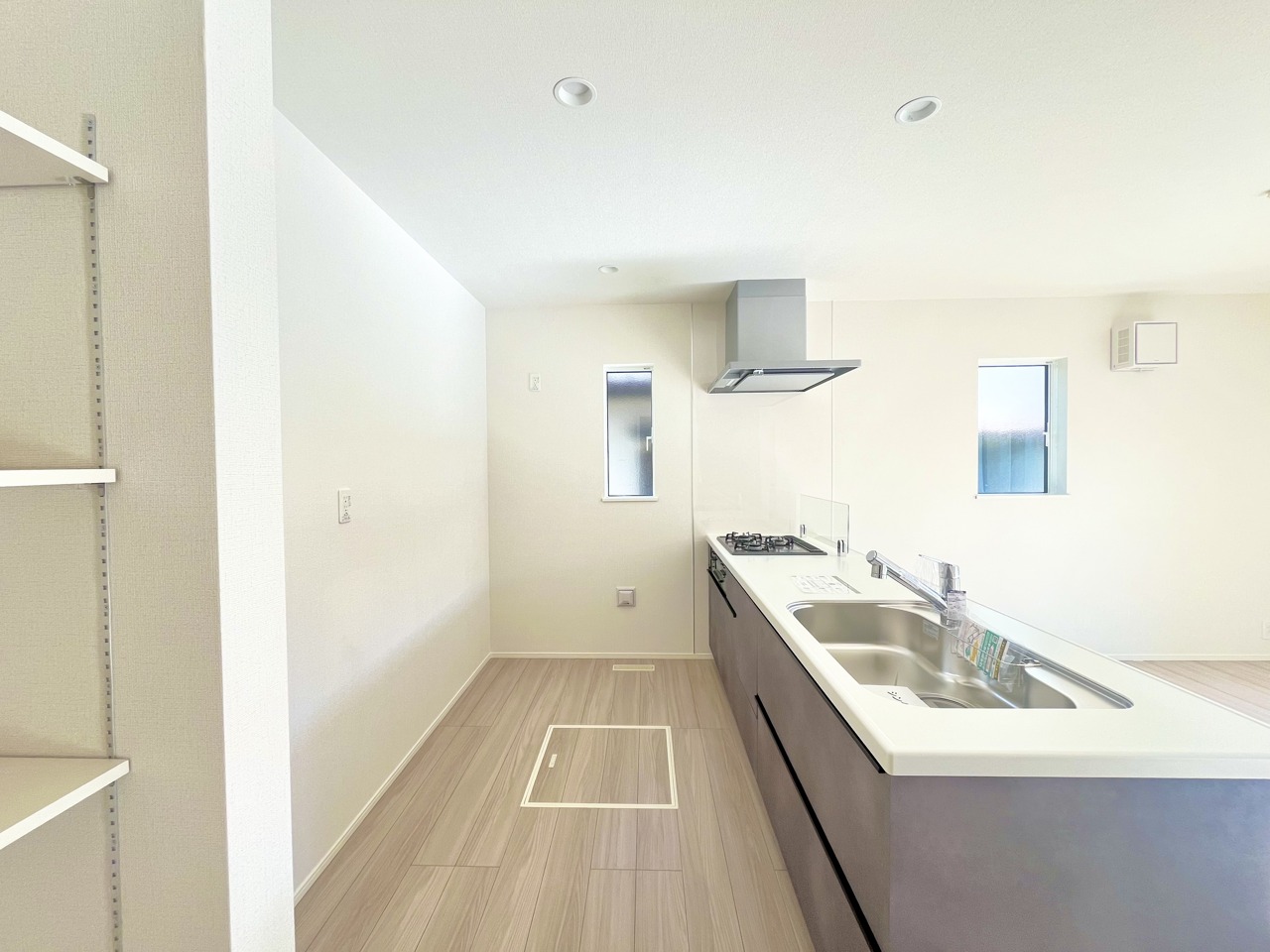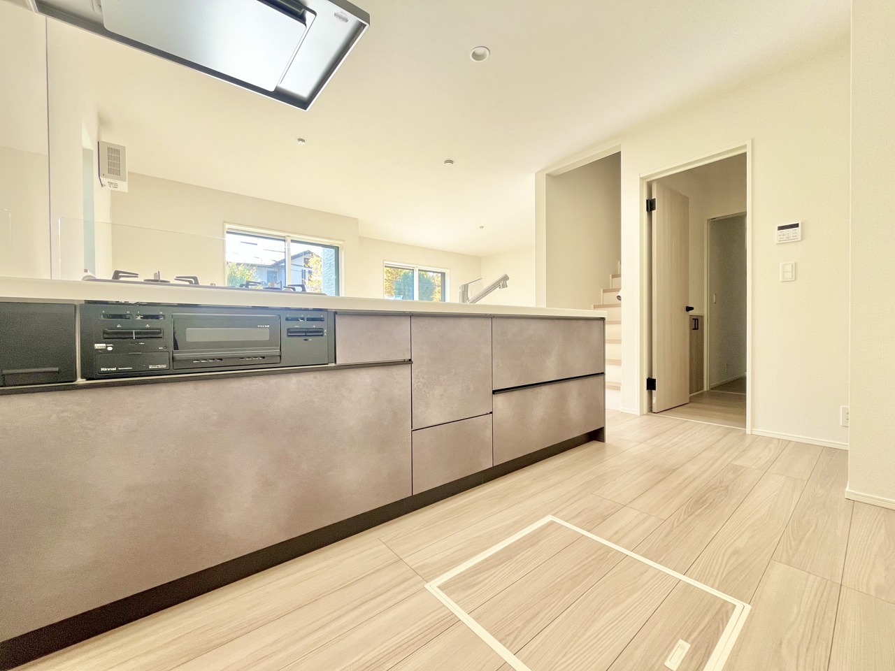 リビングにいる家族の顔が見渡せるカウンターキッチン。お料理もより一層おいしく、楽しく。食器棚を背面に設置しても十分な広さを確保しています。