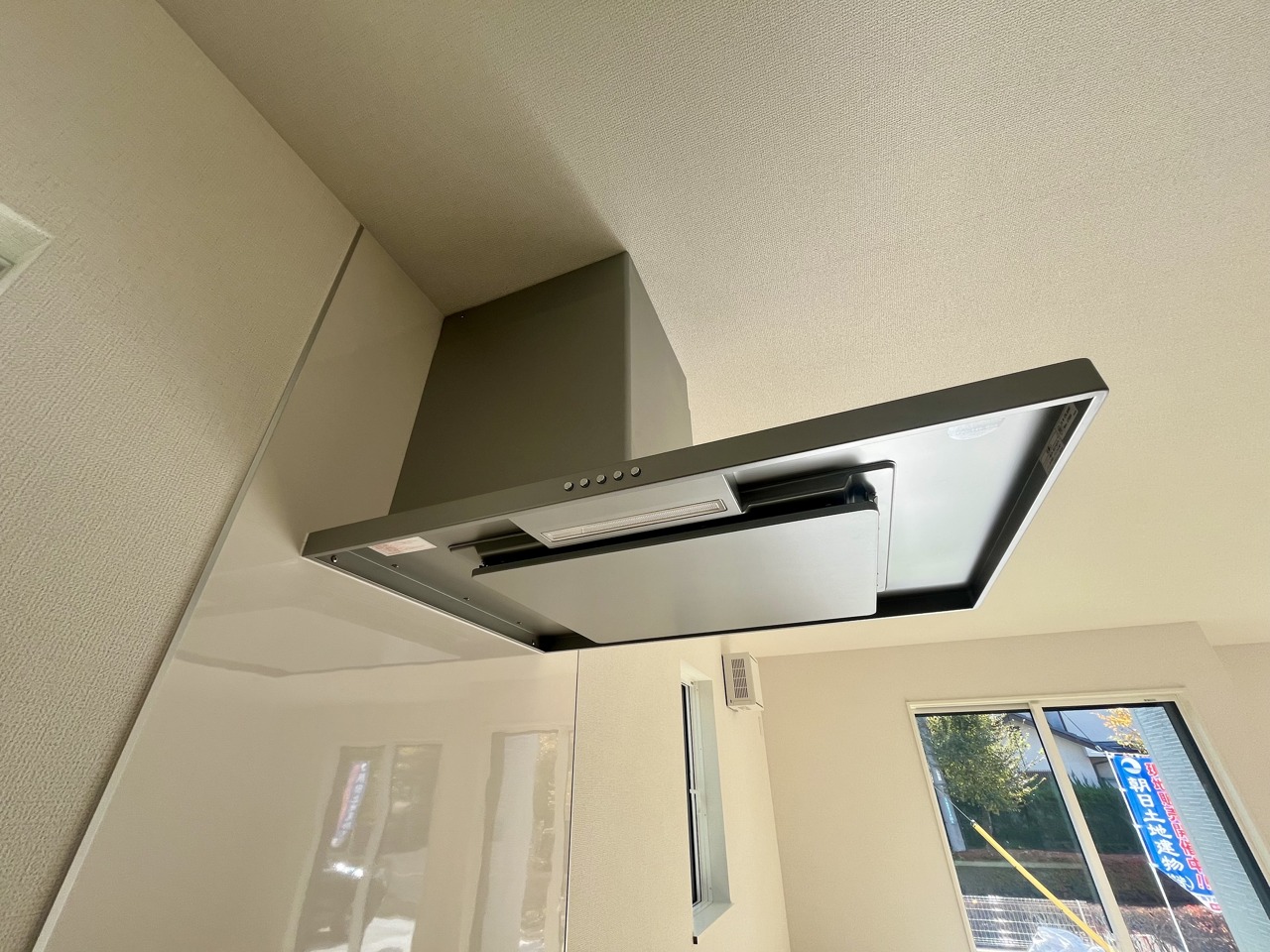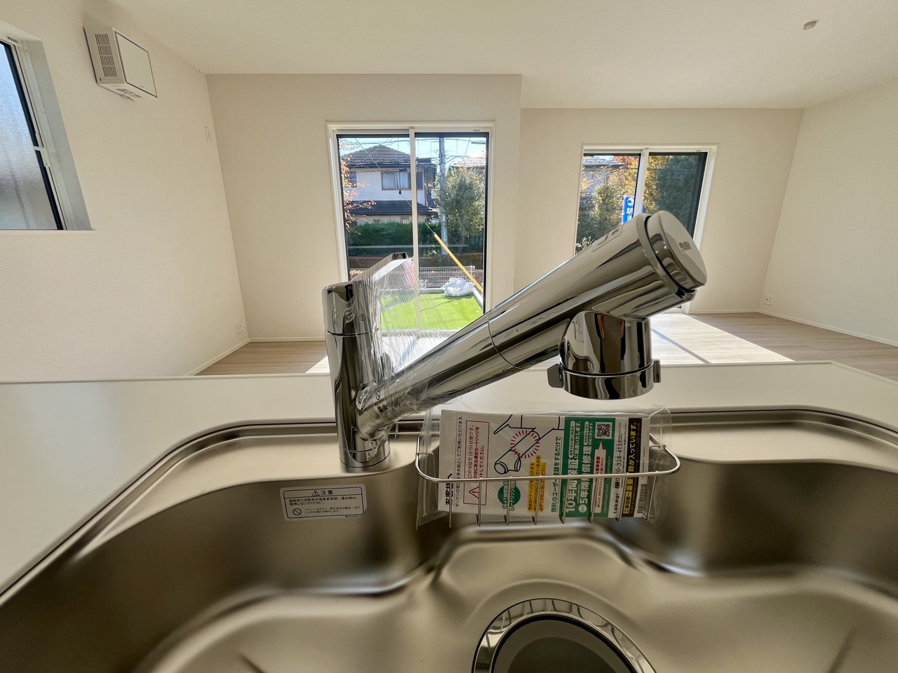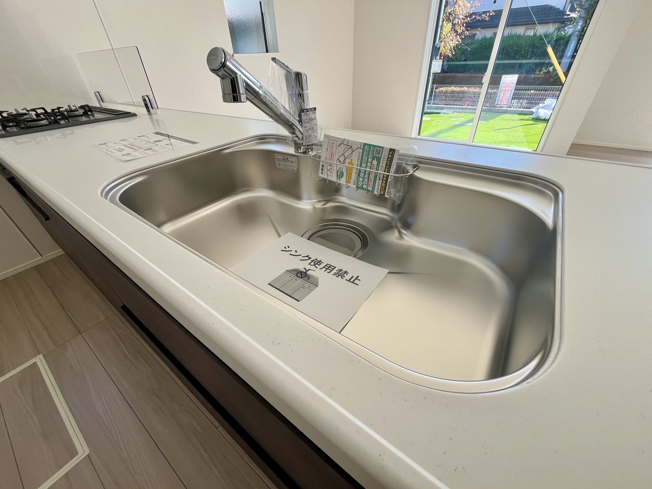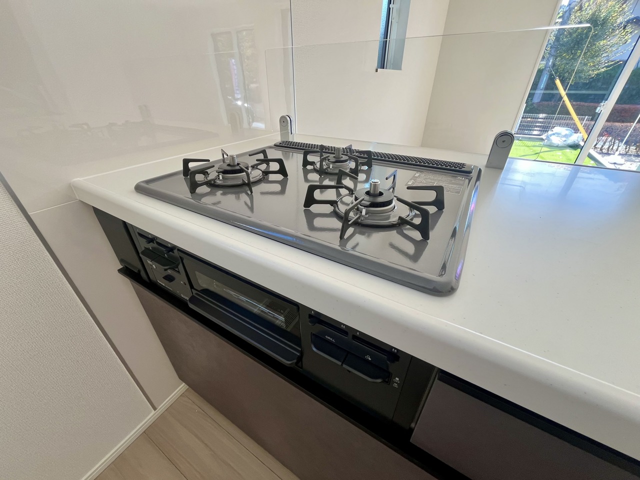 リビングにいる家族の顔が見渡せるカウンターキッチン。お料理もより一層おいしく、楽しく。食器棚を背面に設置しても十分な広さを確保しています。