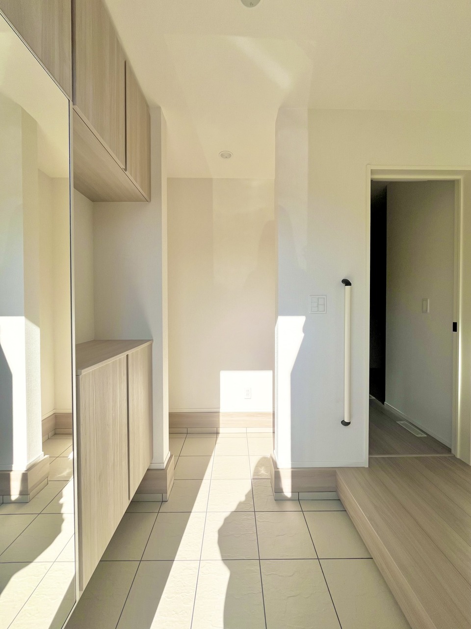 お宅の顔となる明るく開放的な玄関。ご家族皆様様の靴を収納できるスペースと全身鏡があり、お出掛け前に身だしなみチェックもできます。