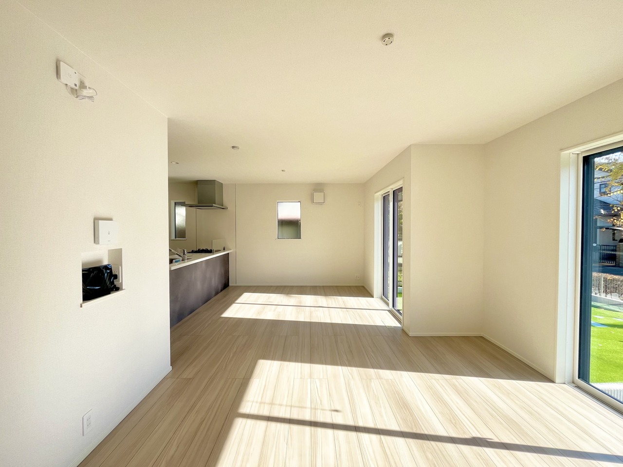 家族や友人、両親、親戚とこれから沢山の時間を紡ぐのだろう。そこを彩るのは窓から見える青い空、心地よい緑。そんなイメージが膨らむリビングスペース。