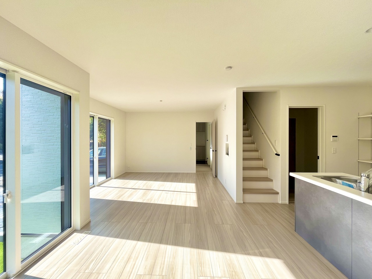 大きな開口部から明るい光が差し込む、日中の室内の明るさがこの部屋の魅力です。