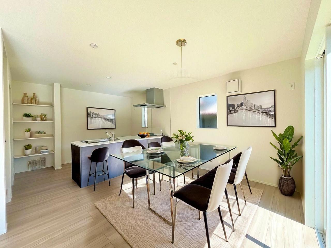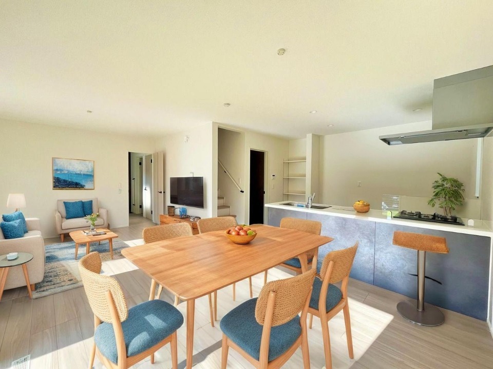 家族団欒のリビング。陽光差し込む食卓には家族の会話とスマイルが溢れます。いつまでもここで食卓を囲みたくなる、そう感じさせてくれるスペース。