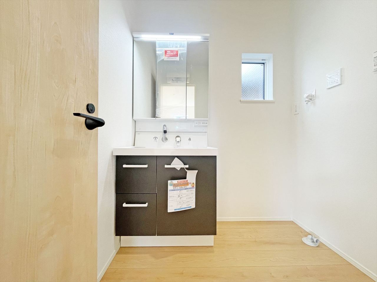 三面鏡にハンドシャワー付き、 使いやすい洗面台。