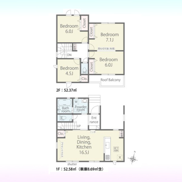 | 設備 | 公営水道、個別浄化槽、個別LPG ハーフビルトインガレージ |