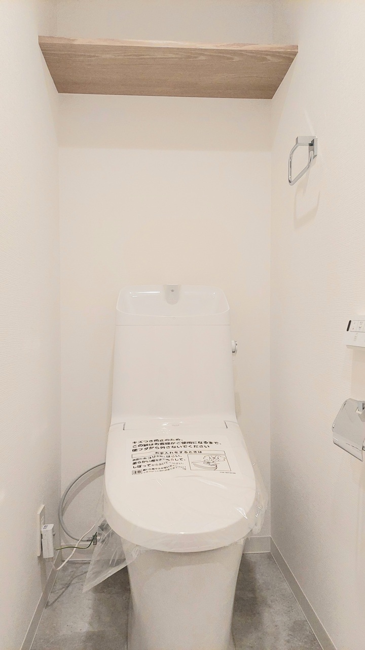 ウォシュレット機能付きのトイレ。収納棚もあり実用性も兼ね備えた造り。