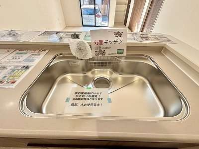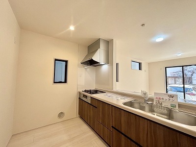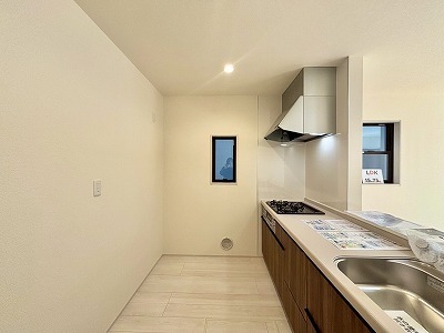 リビングにいる家族の顔が見渡せるカウンターキッチン。お料理もより一層おいしく、楽しく。食器棚を背面に設置しても十分な広さを確保しています。