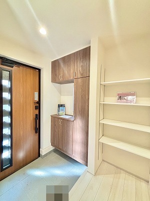 明るく開放的な玄関、靴の脱ぎ履きもしやすく、収納も豊富でご家族皆様の靴をスッキリ収納できます。