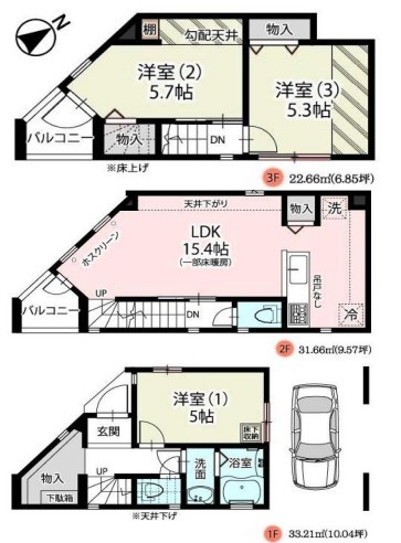 | 間取 | 3LDK (LDK15.4帖、洋室5.7帖、洋室5.3帖、洋室5帖) | ||