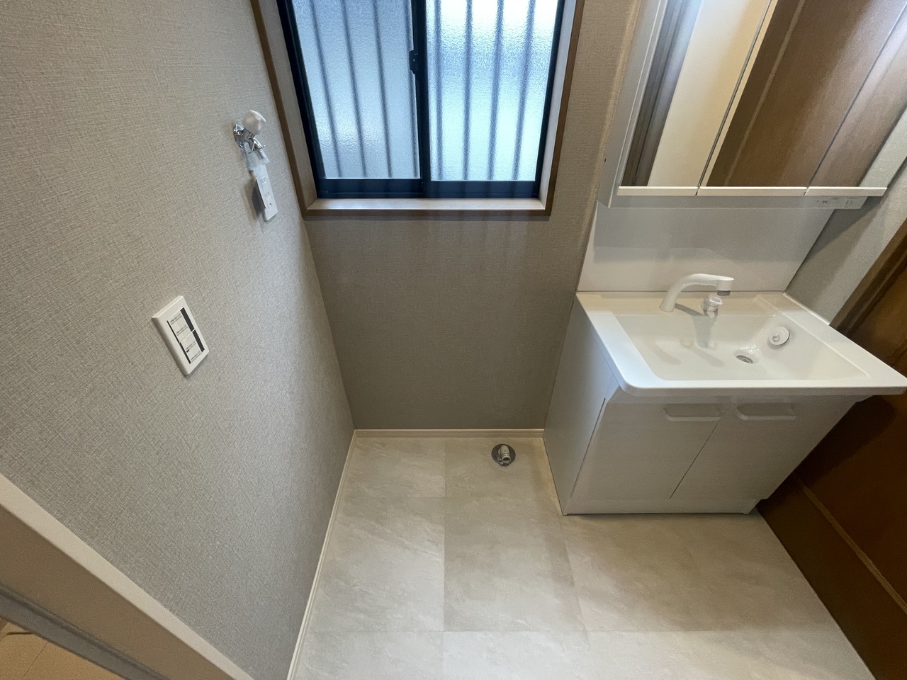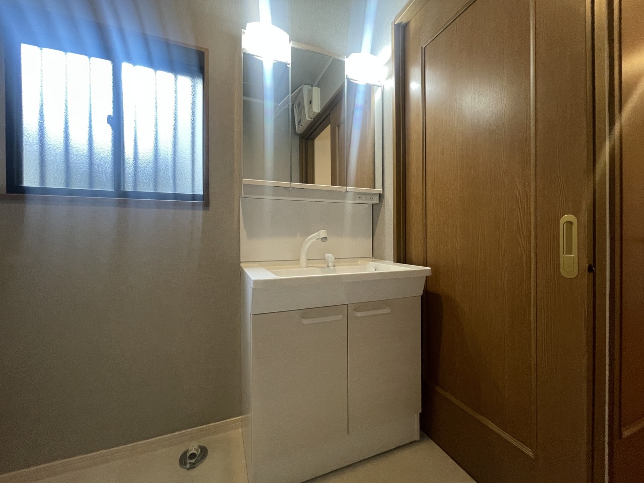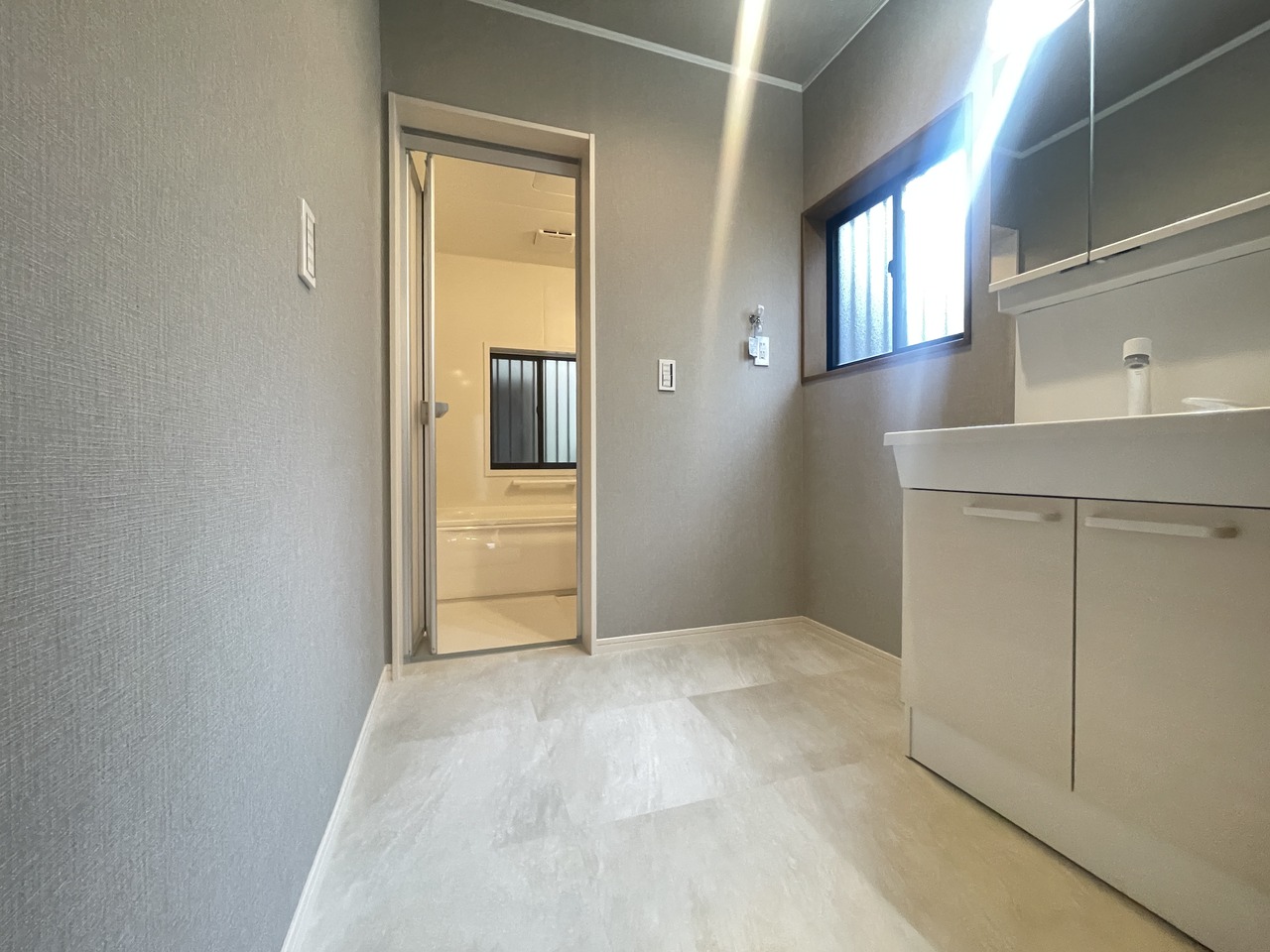 収納豊富な三面鏡付洗面化粧台。水回りのあれこれがキレイに収まりそうですね。