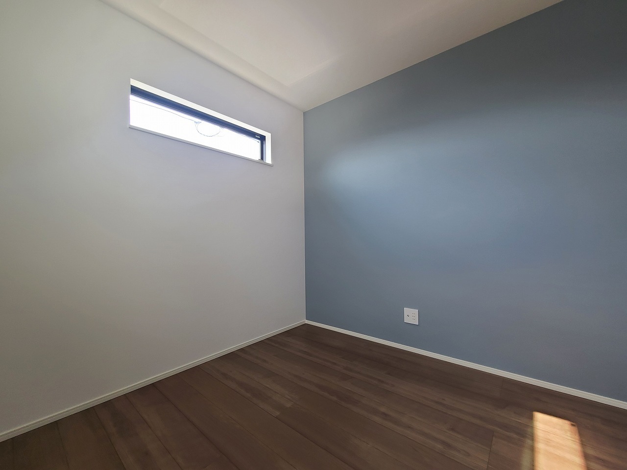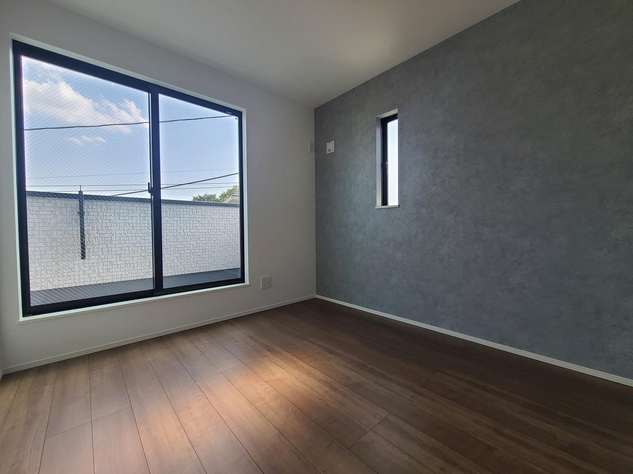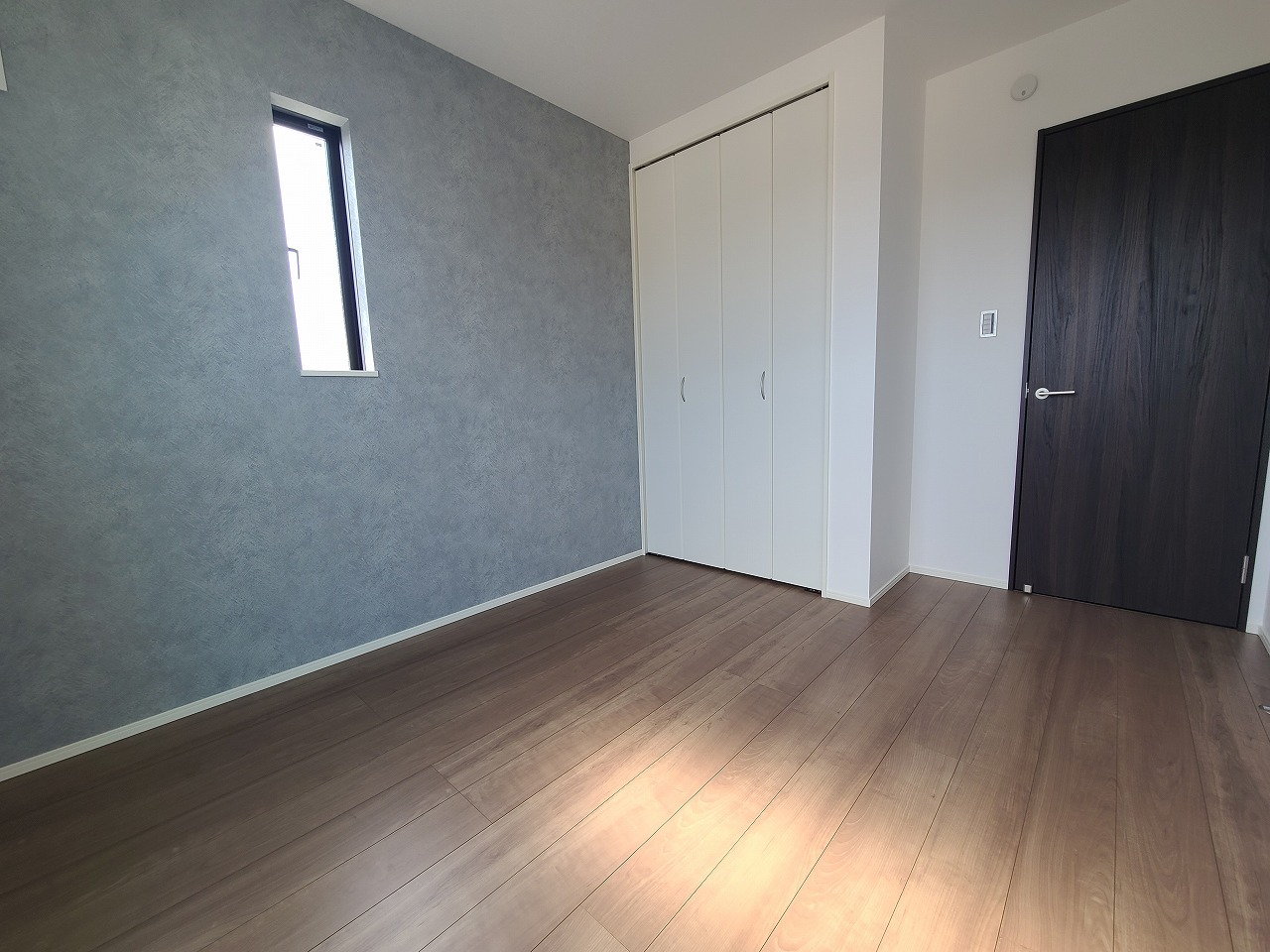 アクセントクロスを使用したオシャレな洋室。窓からそそぐ陽の光が眩しいベッドルームは、朝の目覚めが心地良く迎えられそうです。
