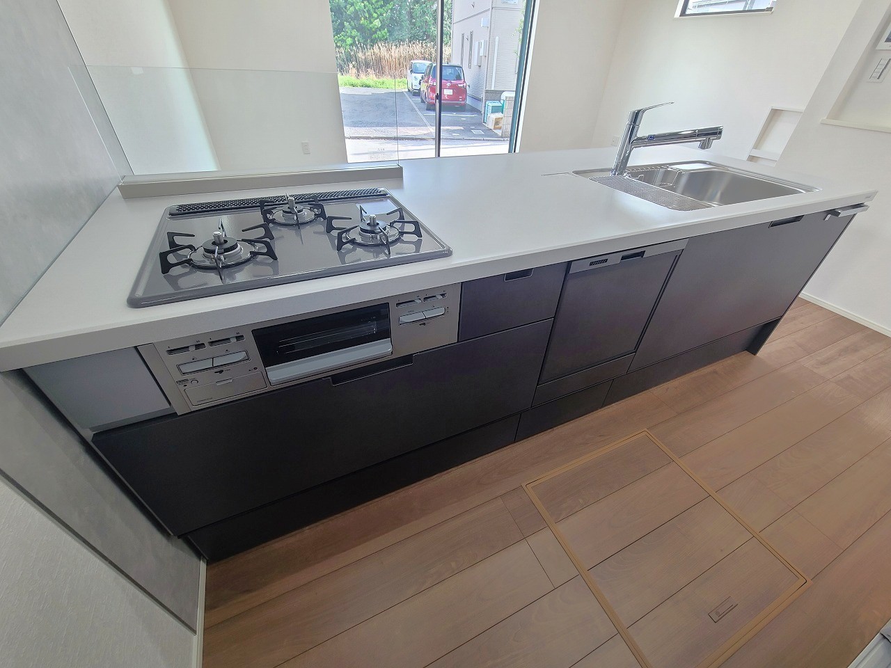 リビングにいる家族の顔が見渡せるカウンターキッチン。お料理もより一層おいしく、楽しく。食器棚を背面に設置しても十分な広さを確保しています。