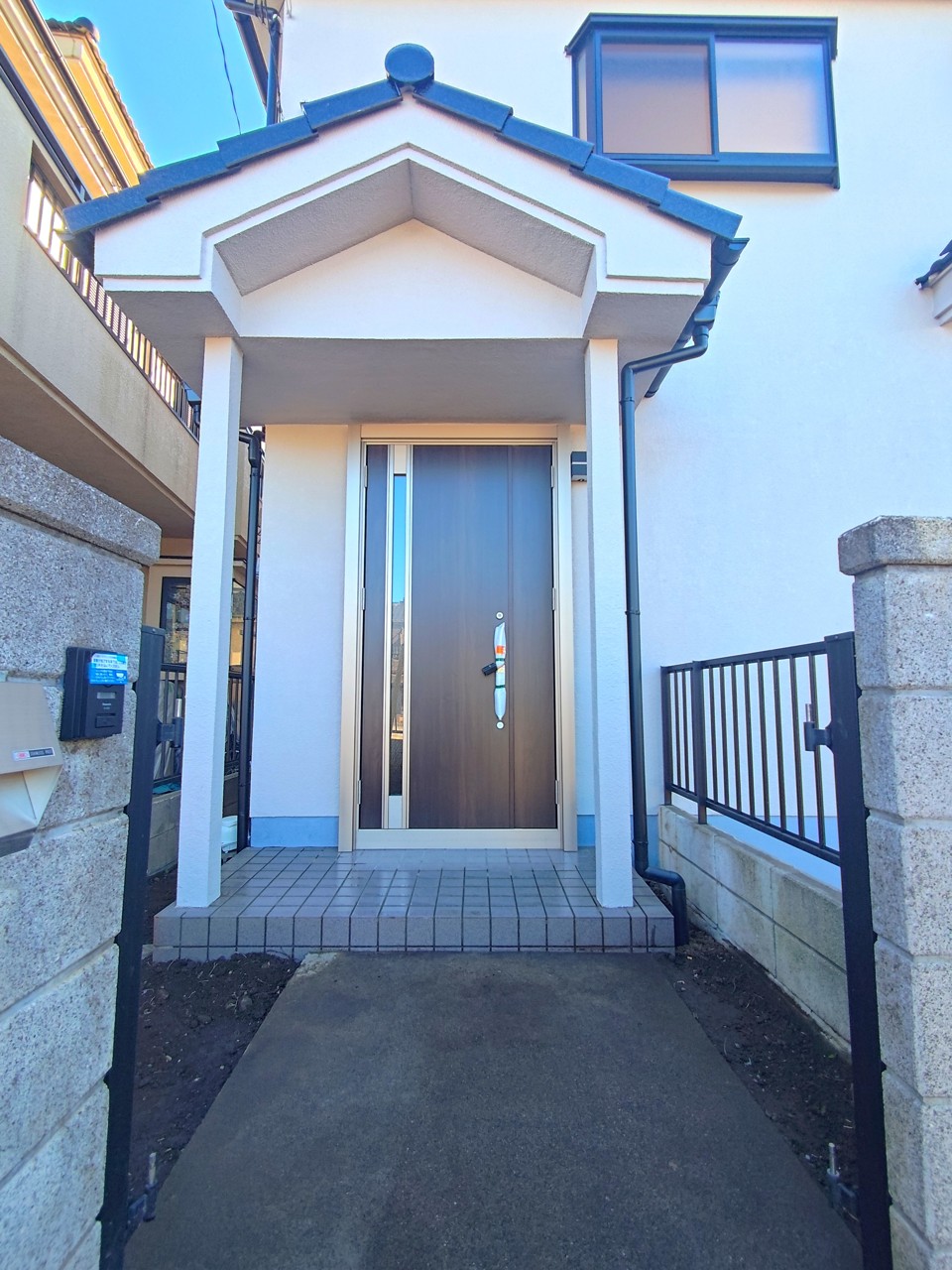 ダブルロック仕様のキレイな玄関ドア。 庇が玄関入口を雨から守ります。