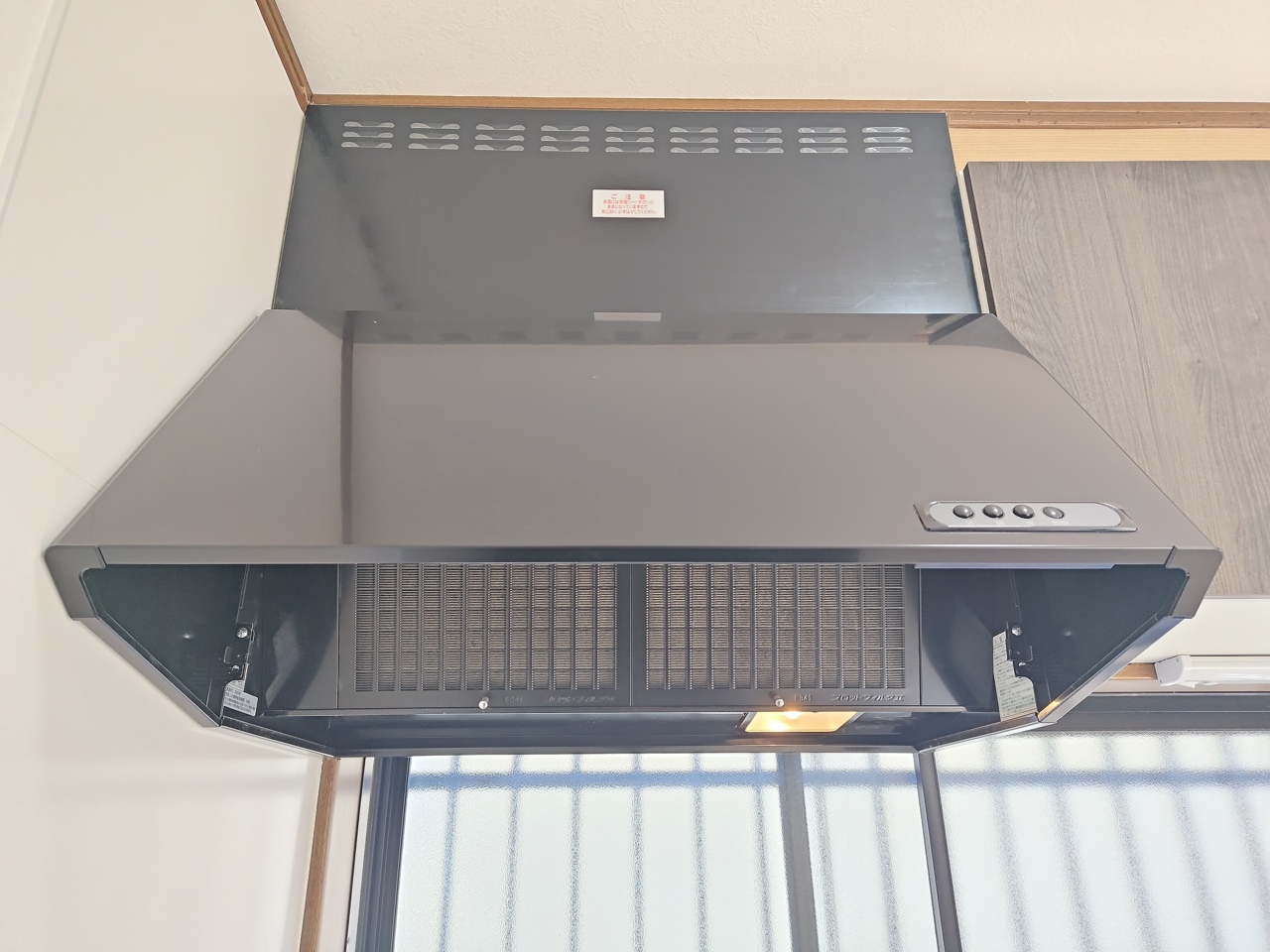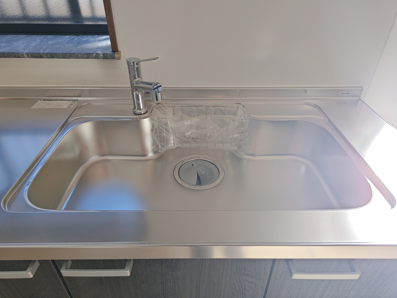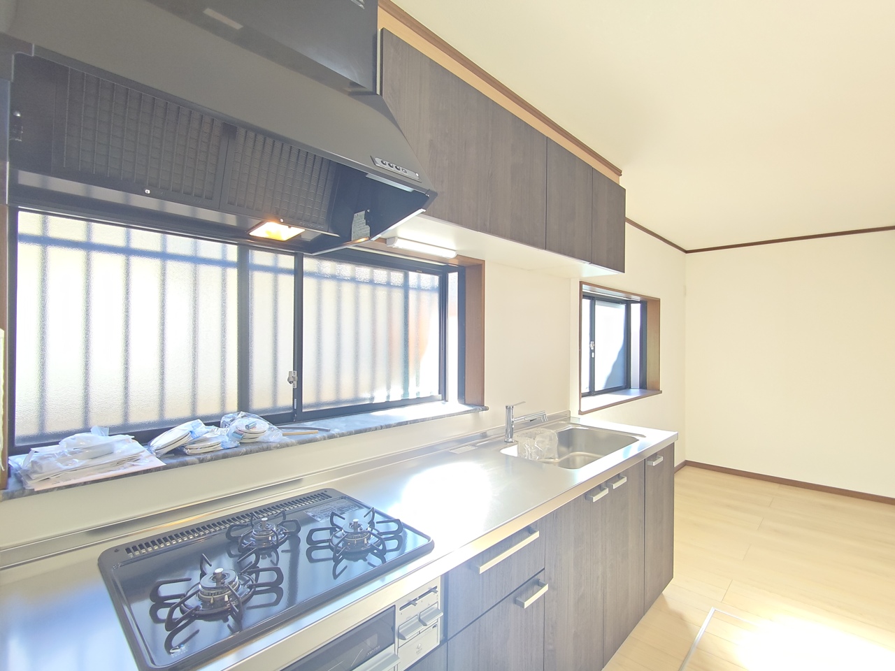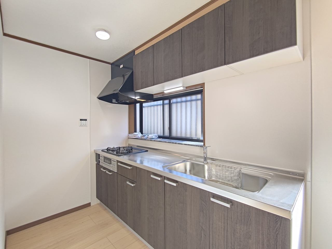 壁付けの新品システムキッチン。 吊戸棚収納も備え付けられており、十分な収納力を備えたキッチンです。