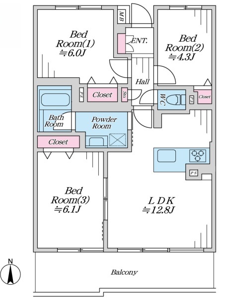 | 間取 | 3LDK (LDK12.8帖、洋室6.1帖、洋室6.0帖、洋室4.3帖) | ||