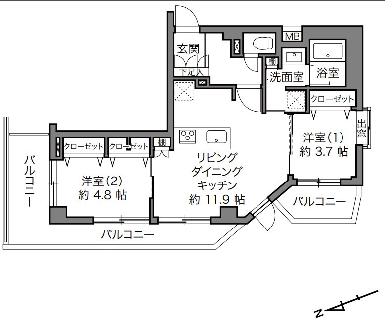 | 間取 | 2LDK (LDK11.9帖、洋室4.8帖、洋室3.7帖) | ||