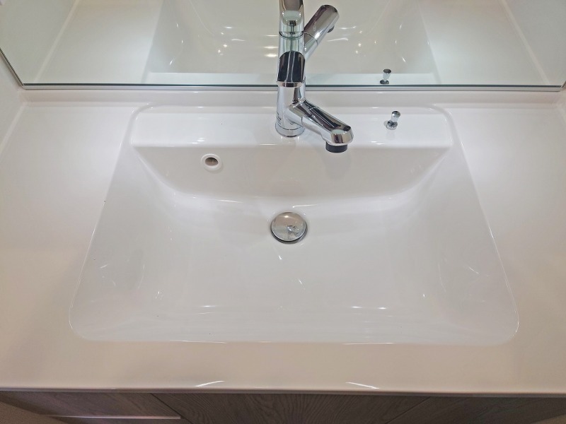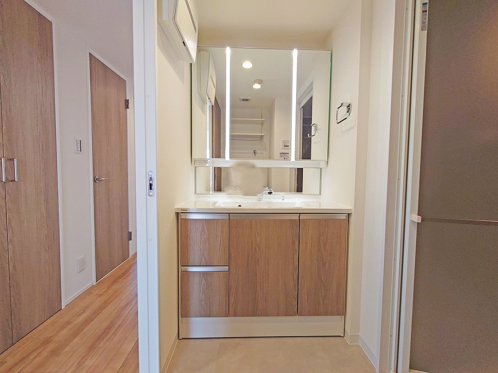 三面鏡にハンドシャワー付き、 使いやすい洗面台。
