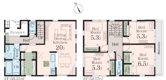 | 間取 | 4LDK (LDK20帖、洋室6.5帖、洋室5.3帖、洋室5.3帖、洋室5.3帖) | ||