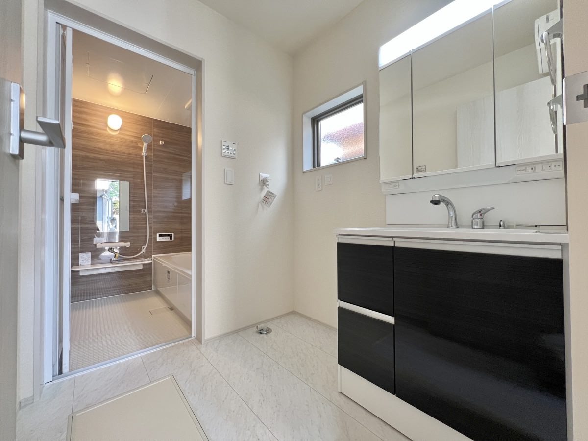 収納豊富な三面鏡付洗面化粧台。水回りのあれこれがキレイに収まりそうですね。