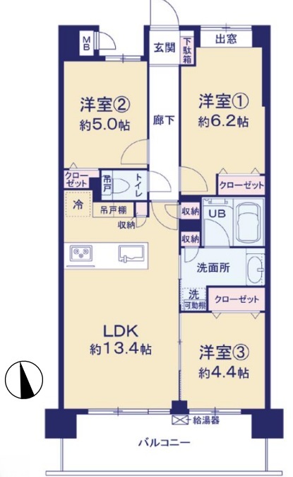 | 間取 | 3LDK (LDK13.4帖、洋室6.2帖、洋室5.0帖、洋室4.4帖) | ||