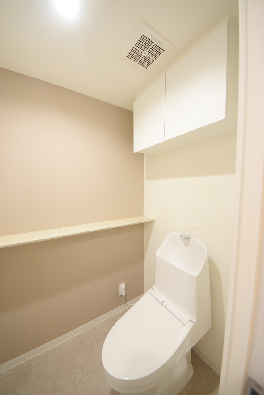 ウォシュレット機能付きのトイレ。収納もあり実用性も兼ね備えた造り。
