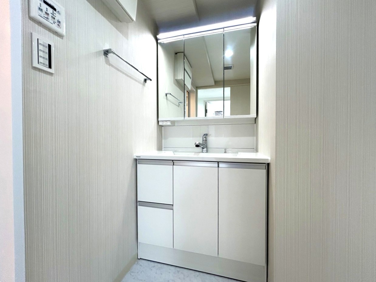 三面鏡を採用した洗面化粧台。鏡の裏にも収納スペースがあります。