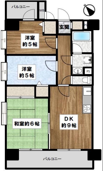 | 間取 | 3DK (DK9帖、和室6帖、洋室5帖、洋室5帖) | ||