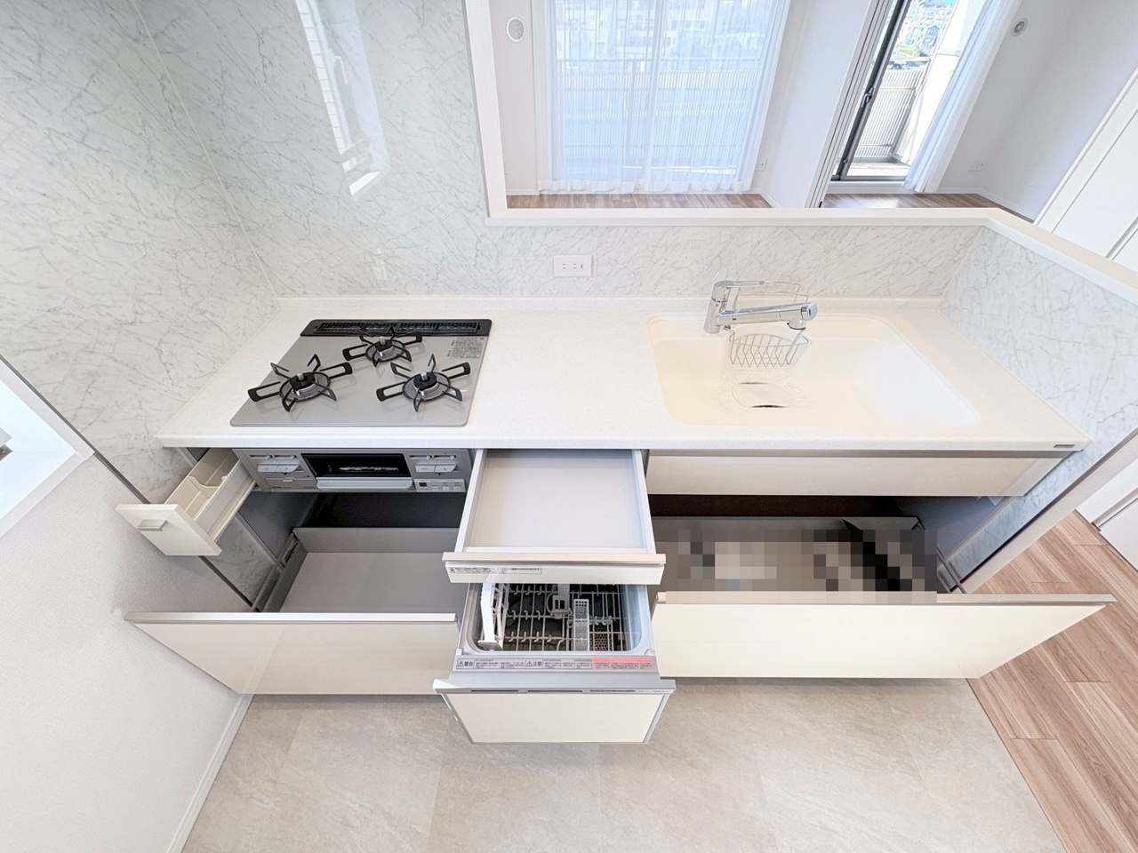 収納スライドをぐっと開けばお鍋や調味料をどんどんしまえる大収納。キッチンはいつもキレイ。