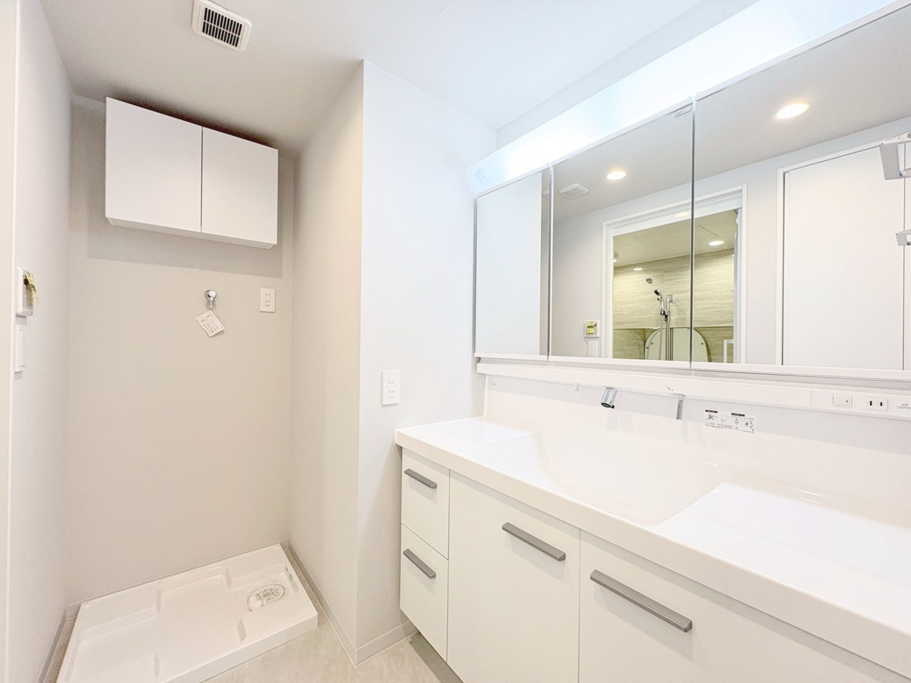マンションならではの広く、鏡の大きな洗面化粧台。