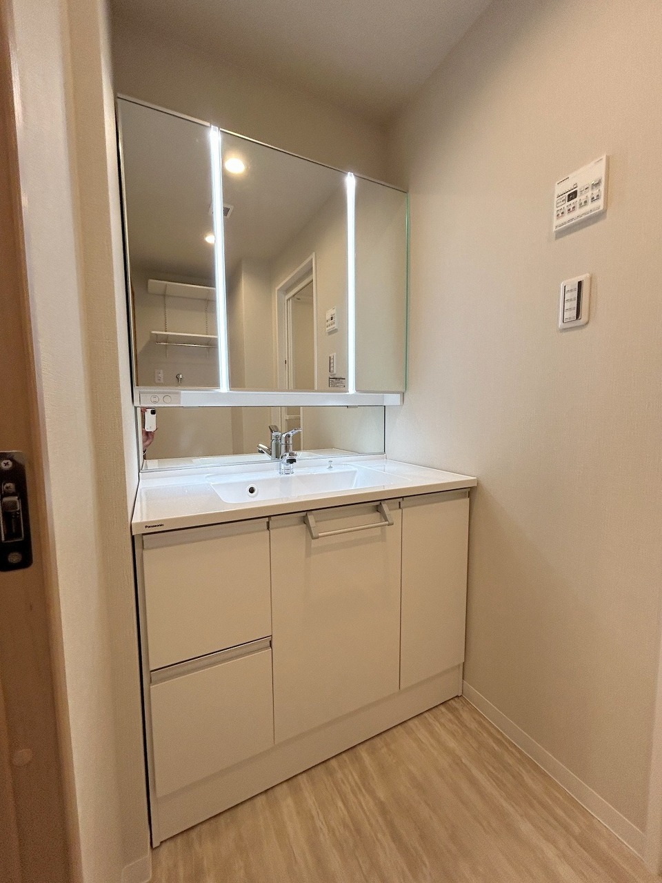 三面鏡を採用した洗面化粧台。鏡の裏にも収納スペースがあります。