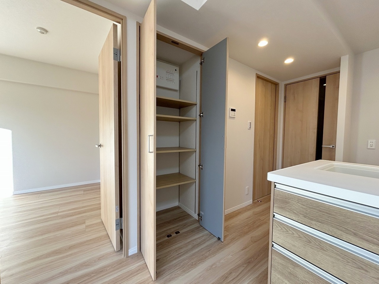 キッチンの脇に、この収納があるだけで、キッチン動線が変わりますね。
